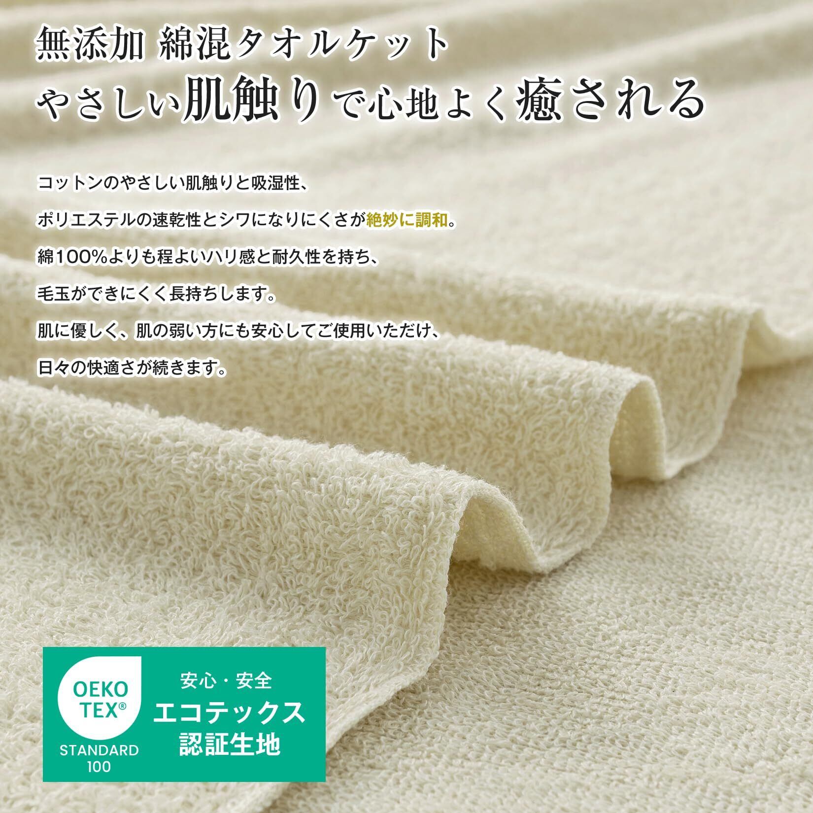 【無添加・安心のOEKO-TEX認証】信頼感を与えるOEKO-TEX認証を取得したタオルケットです。静電気を抑え、肌に優しく刺激が少ないため、肌への負担を軽減し、安心してご使用いただけます。