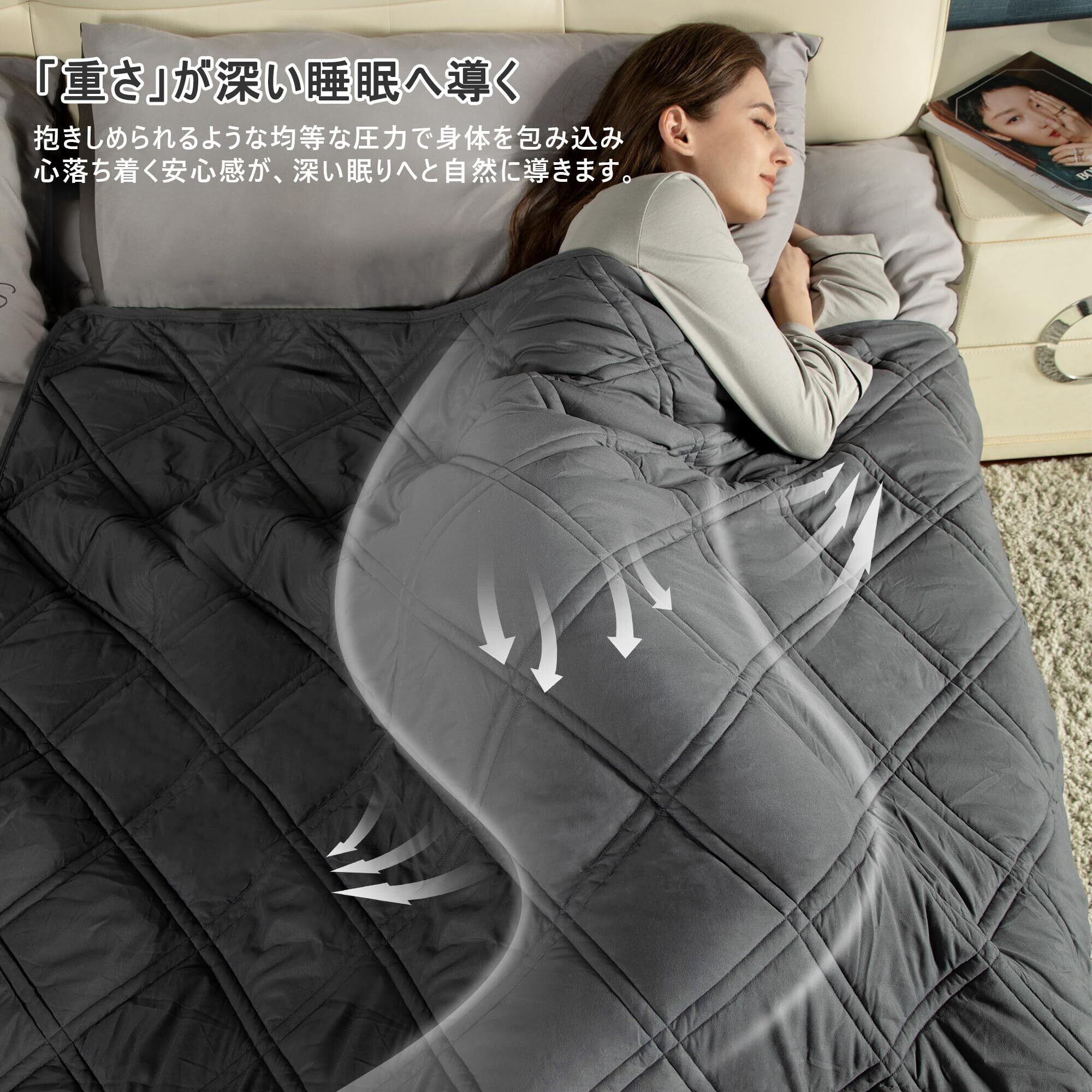 【TV話題の加重ブランケット】Weighted Blanketは一般的な布団よりも、ずっしりした重みがある布団です。日本テレビでも何回話題されていた。ウェイトブランケットは生地を細かくキルティングし、そのマスの中にガラスビーズを均等に詰めて縫い込んで、掛けた時に重さが均等に分散され、 抱きしめられた時のような圧力と同様の効果があり、落着きと安心感が生まれ、深い眠りへ導きます。