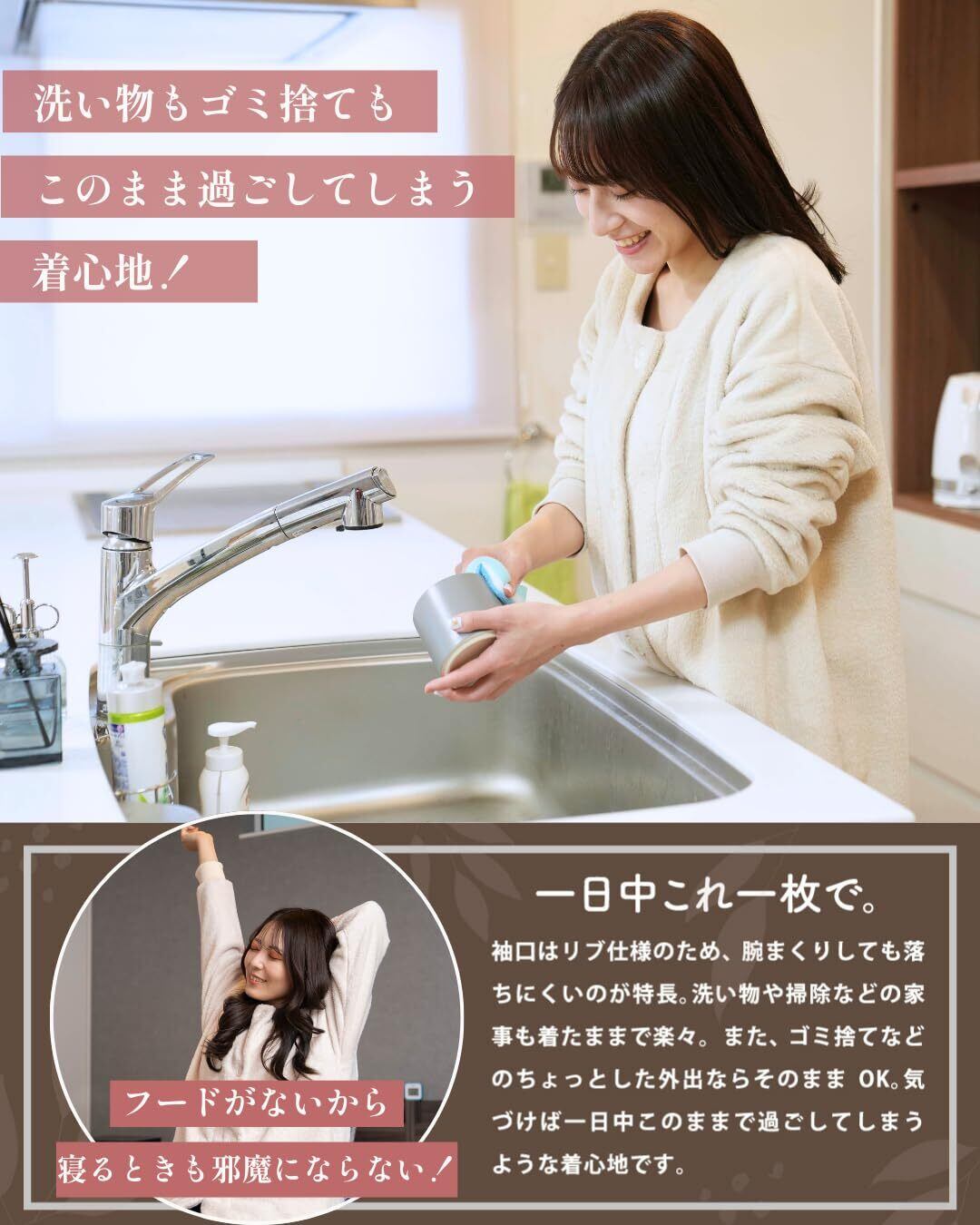 【 毎日を快適に過ごせる 】 動きやすいリブ袖になっており、洗い物や掃除のときにも邪魔になりません。中までふわふわなポケットもついており、スマホの持ち歩きや手が冷えたときにサッと温めることもできます。