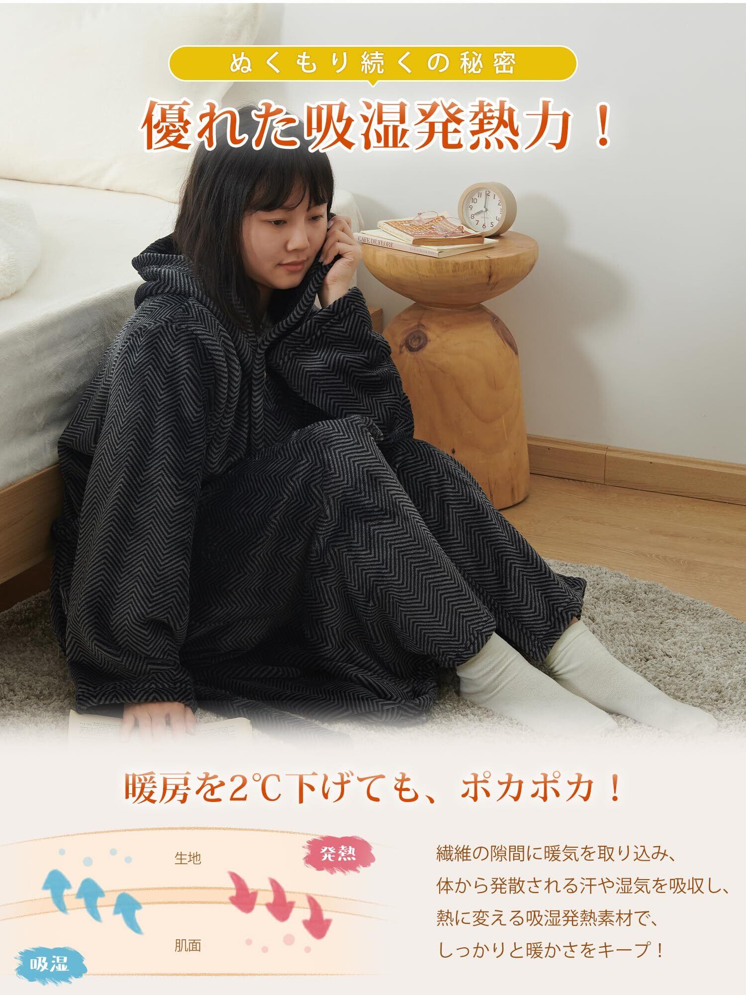 【なめらか・あったかフランネル生地】軽やかでふわふわなフランネル生地を使用した着る毛布、柔らかくなめらかな肌触りを実感できます。吸湿発熱素材で保温力が高く、軽いのに暖かさをしっかりキープ、寒くなる秋冬のルームウェアとして最適です。静電気防止糸を採用するため、冬のパチパチを軽減、着心地抜群!