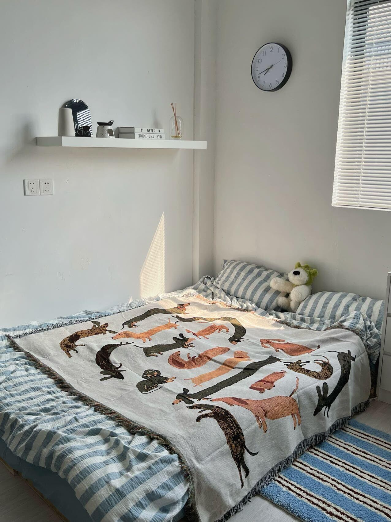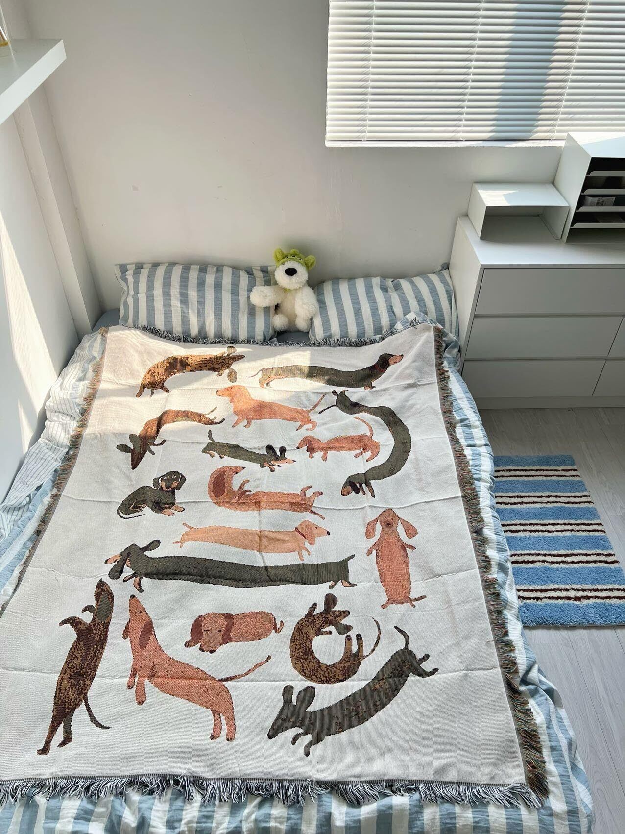 チャームポイント◆ ・愛らしいダックスフントのイラストが散りばめられたデザイン ・落ち着きのあるベージュ基調でお部屋の雰囲気に馴染みやすい ・肌触りの良い素材使用で快適な使い心地