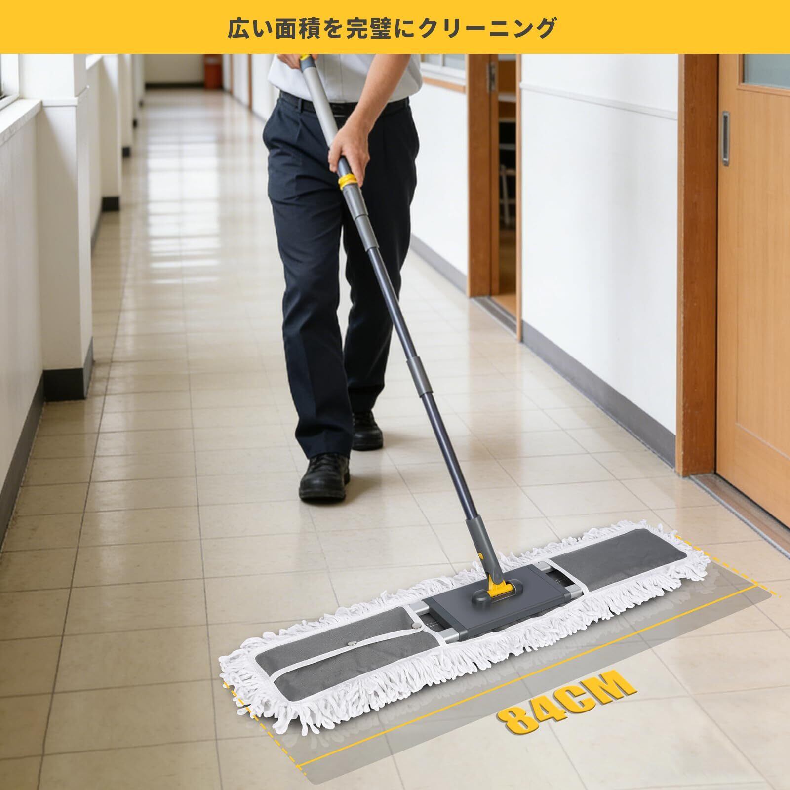 【大型フロアモップ】フロアモップサイズ:84*11*154cm 80cm幅の大型モップヘッドで広い範囲を掃除でき、掃除時間の短縮と掃除効率の向上に貢献します。
