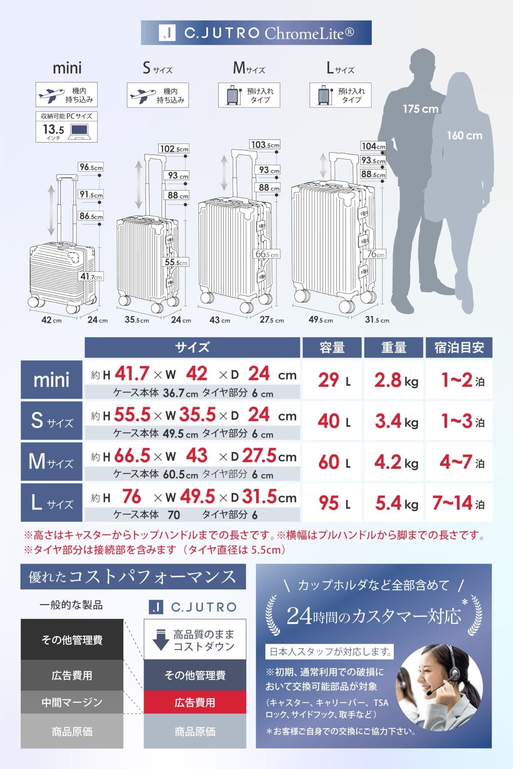 【サイズ&カラー】スーツケースは4サイズ、3色展開<サイズ>総外寸:高さ×横幅×奥行(cm)、容量(L)、重量(kg) mini : 41.5 × 42 × 24 、3辺合計107cm(機内持込可)、 21L 、 2.8kg 、Sサイズ : 55.5 × 35.5 × 24 、3辺合計115cm(機内持込可)、 45L 、 3.4kg、Mサイズ : 66.5 × 43 × 27.5 、3辺合計137cm、 60L 、 4.2kg、Lサイズ : 76 × 49.5 × 31.5 、3辺合計157cm 、 95L 、 5.4kg<カラー>ブラック(Black)、シルバー(Silver)、ブルー(Blue)※ブルーはssなし