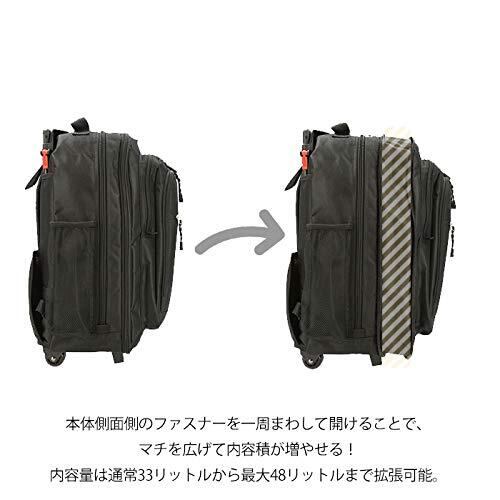 『引く』『持つ』『背負う』と3通りの使い方ができるので、シーンに合わせてお使いいただけるリュック式キャリーバッグ。 男性はもちろん、女性やお子様もお使いいただけるアイテムです。 メインスペースは開閉しやすいダブルジップを採用。衣類なら2泊程度が十分に収納可能な大容量サイズ。 出先で荷物が増えても安心なマチ幅拡張機能を搭載。(約8cmアップ) 本体のサイドにメッシュポケットを配置しているので、ペットボトルや小物類など必要な時にサッとアクセスできます。 キャリーバーは多段階に調節可能。スタイルに合わせた最適な高さに設定できます。 キャスターは2輪式を採用。安定性がありスムーズな走行が可能。 幅広い年代の方にお使いいただけるバッグです。