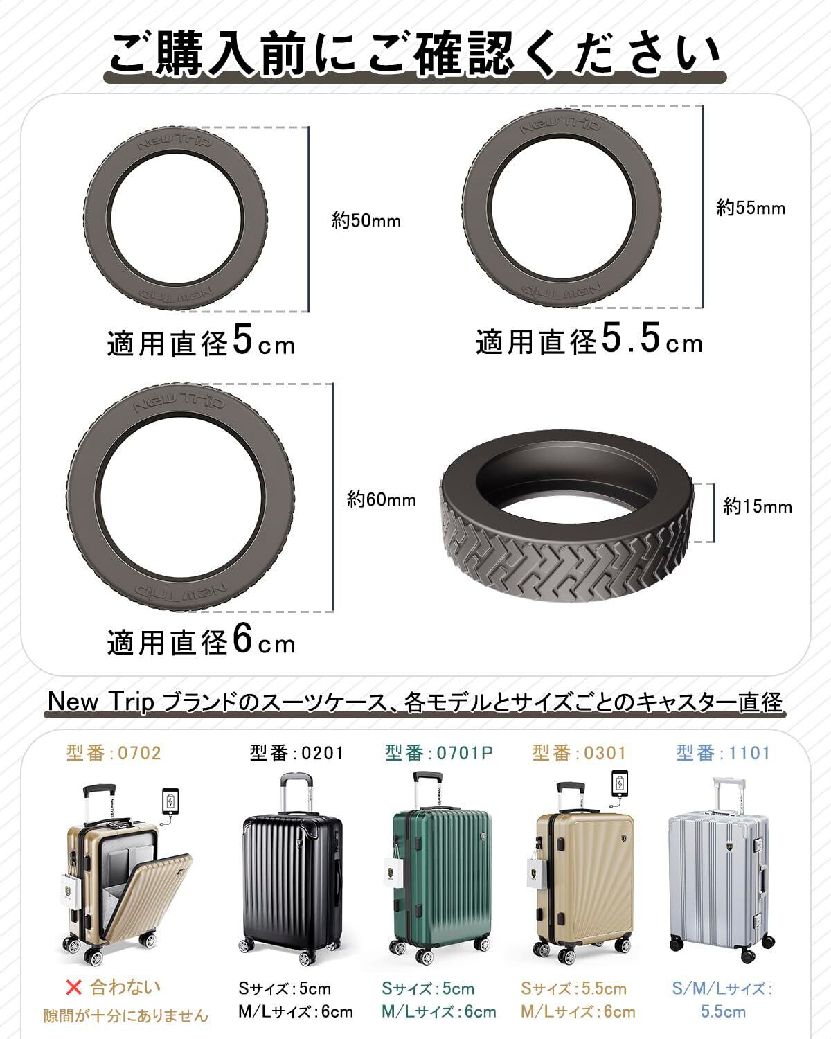 【ぴったりサイズでキャスター保護、寿命延長】市販のスーツケース用ホイールカバーは通常1サイズのみで、キャスターのサイズに完璧に合わないため、カバーが外れやすいという問題があります。当社のキャスターカバーは5cm、5.5cmと6cmの3種類サイズを用意しています。適切なサイズを選ぶことでホイールを効果的に保護し、摩耗を減らし、スーツケースの寿命を延ばせます。さらに、広いカバー面積でキャスターをしっかり包み込み、脱落や汚れ、ダメージも防ぎます。