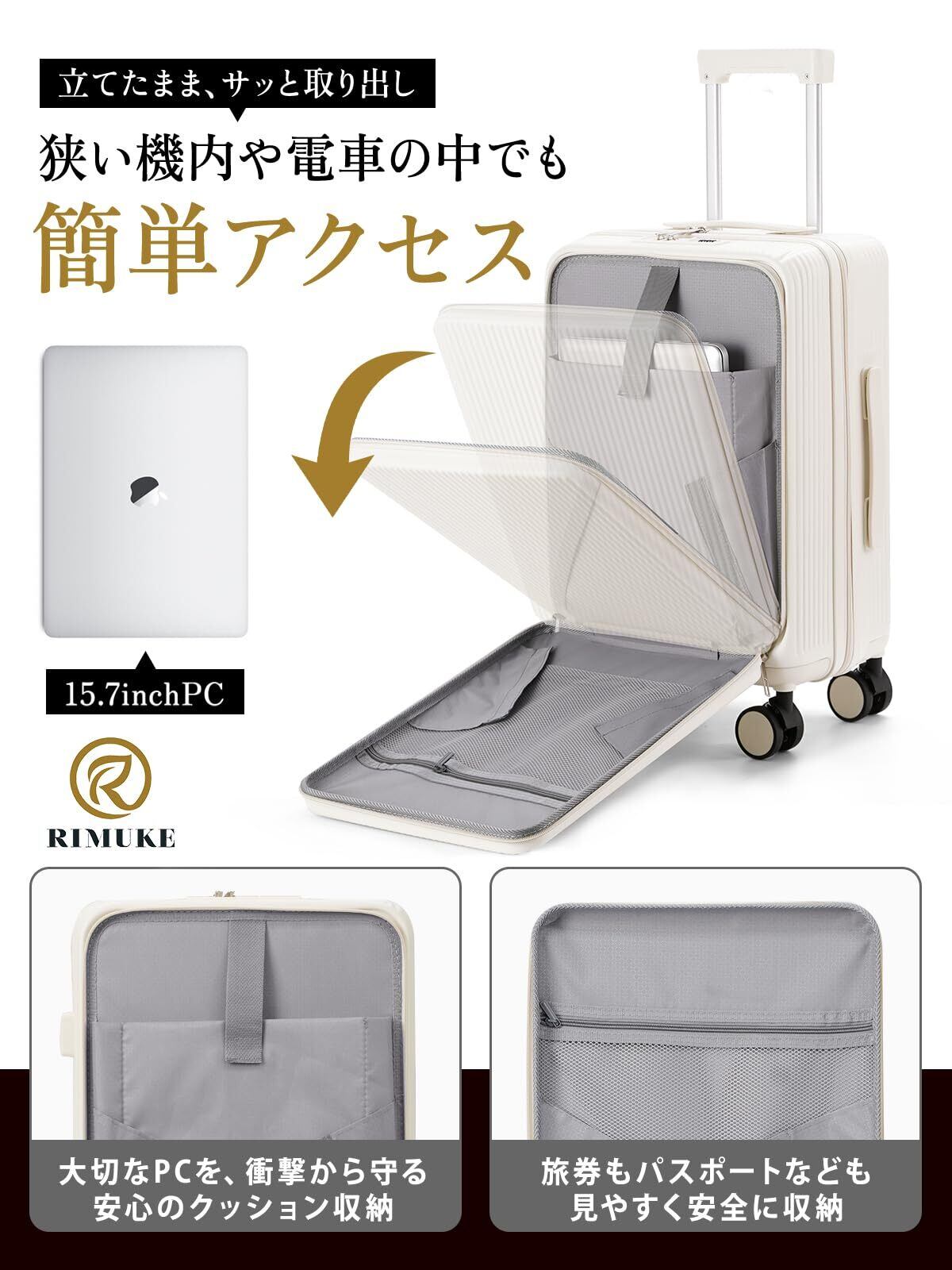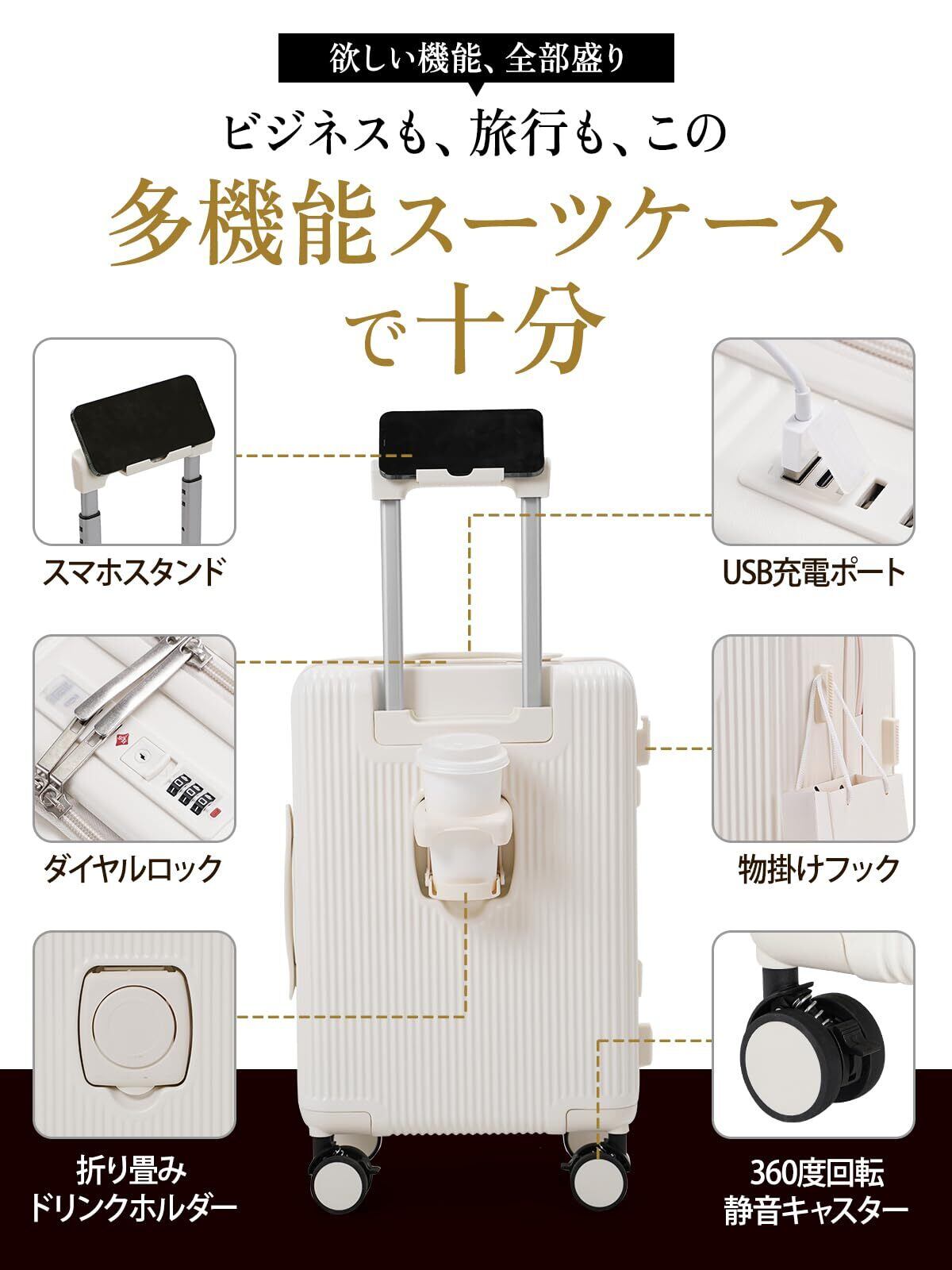 【数量限定】前開き スーツケース 機内持ち込み キャリーケース パソコン収納ポケット USBポート付き カップホルダー付き キャリーケース 超軽量 360度回転 耐衝撃 ック 静音 旅行 ビジネス 出張 1泊2泊3泊 ホワイト, Sサイズ/機内持込 (41L容量)