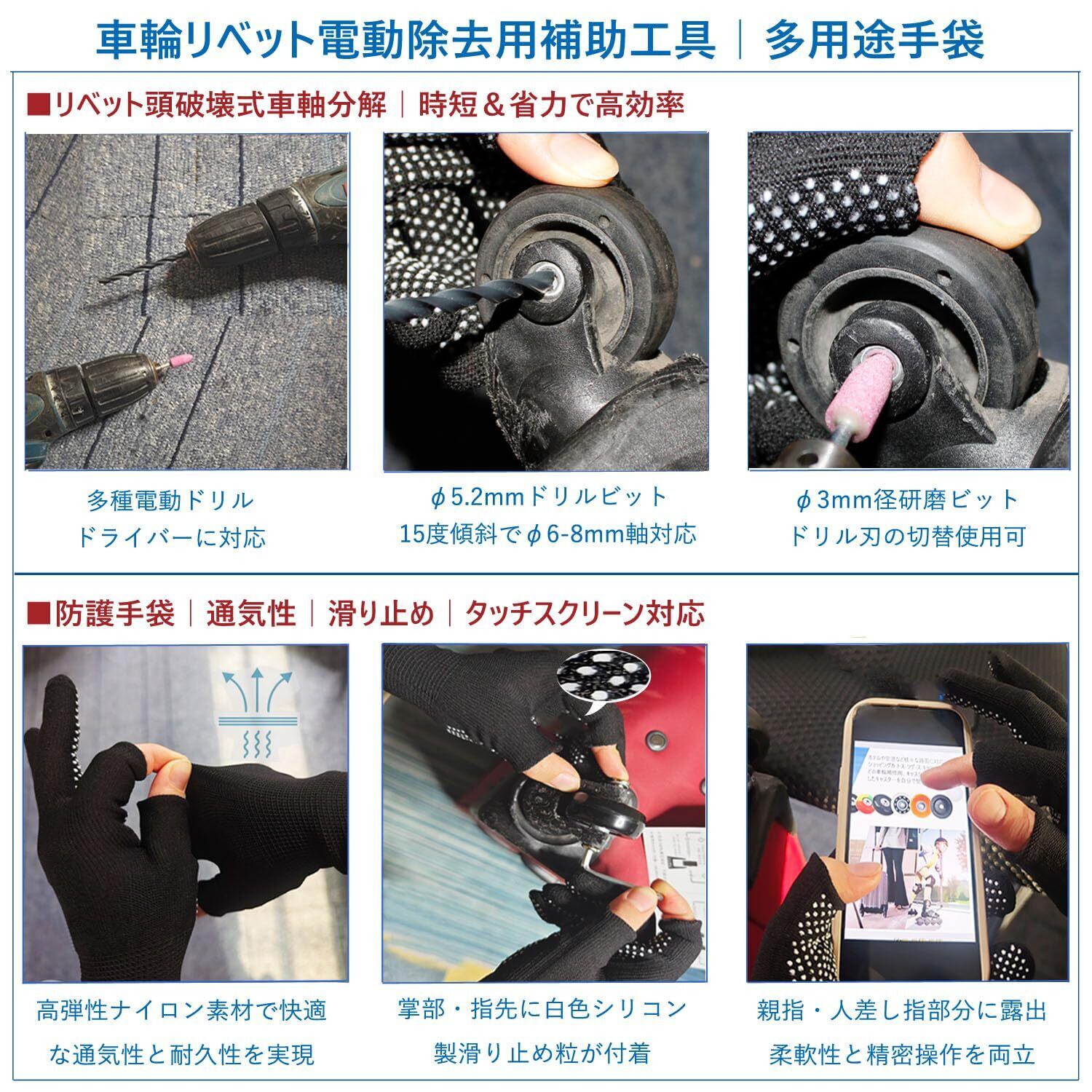 商品仕様:超静音シリーズ用交換タイヤキット。キット内容:4*キャスター(車輪)、 10*ボルト(車軸30mm*4、35mm*4、60mm*2)、10*ネジ 、 8*ワッシャー 、6*φ8軸用変径スリーブ 、1*多用途改良防護手袋、 2*六角レンチ、電動補助工具(1*ドリルビット・1*研磨ヘッド-サービス品)、1*日本語説明書。