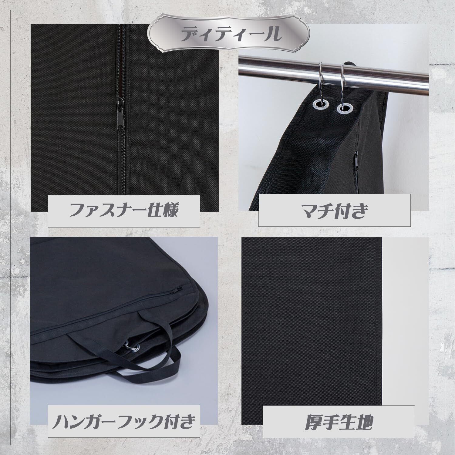通気性に優れた不織布製:大切な衣類をホコリなどの汚れからガード。下部も縫製されているので、全方位からのホコリの侵入を防ぎます。