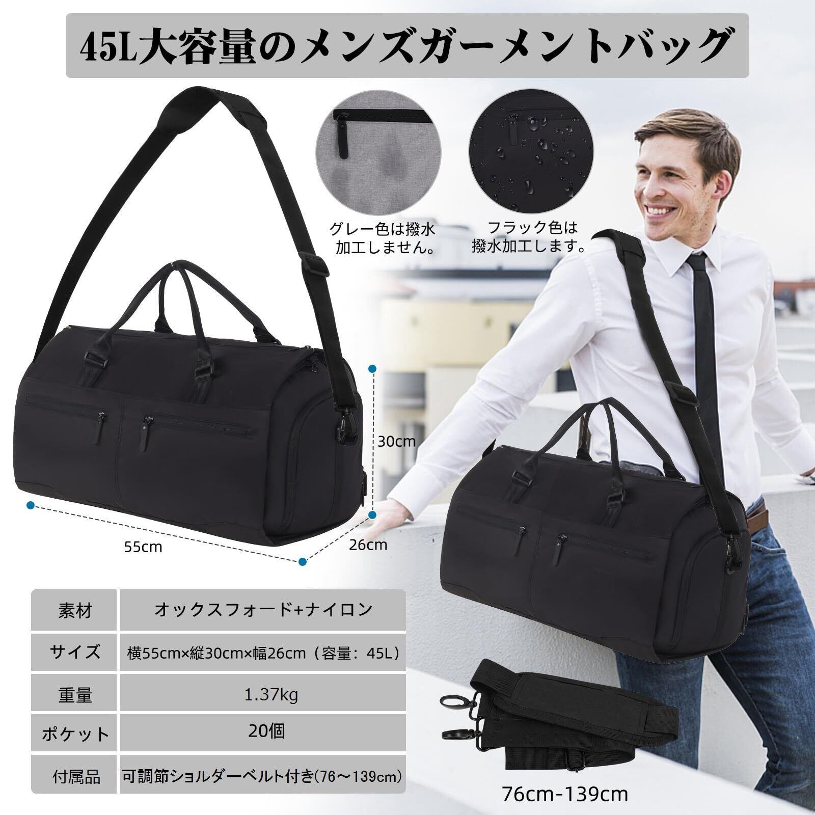 【高品質オックスフォード&スーツシワ防止対策】高品質オックスフォード素材を採用し、丁寧に出来上がりました。耐磨耗性と耐久性にも優れます。スーツ収納ポケットは拡張可能デザインを採用され、服装収納スペースを拡大、衣類をシワなく持ち運ぶことが実現!頻繁にスーツを出したり入れたりする方はお勧めです。防シワ性もいいし、通気性もよく、耐久性にも優れています。