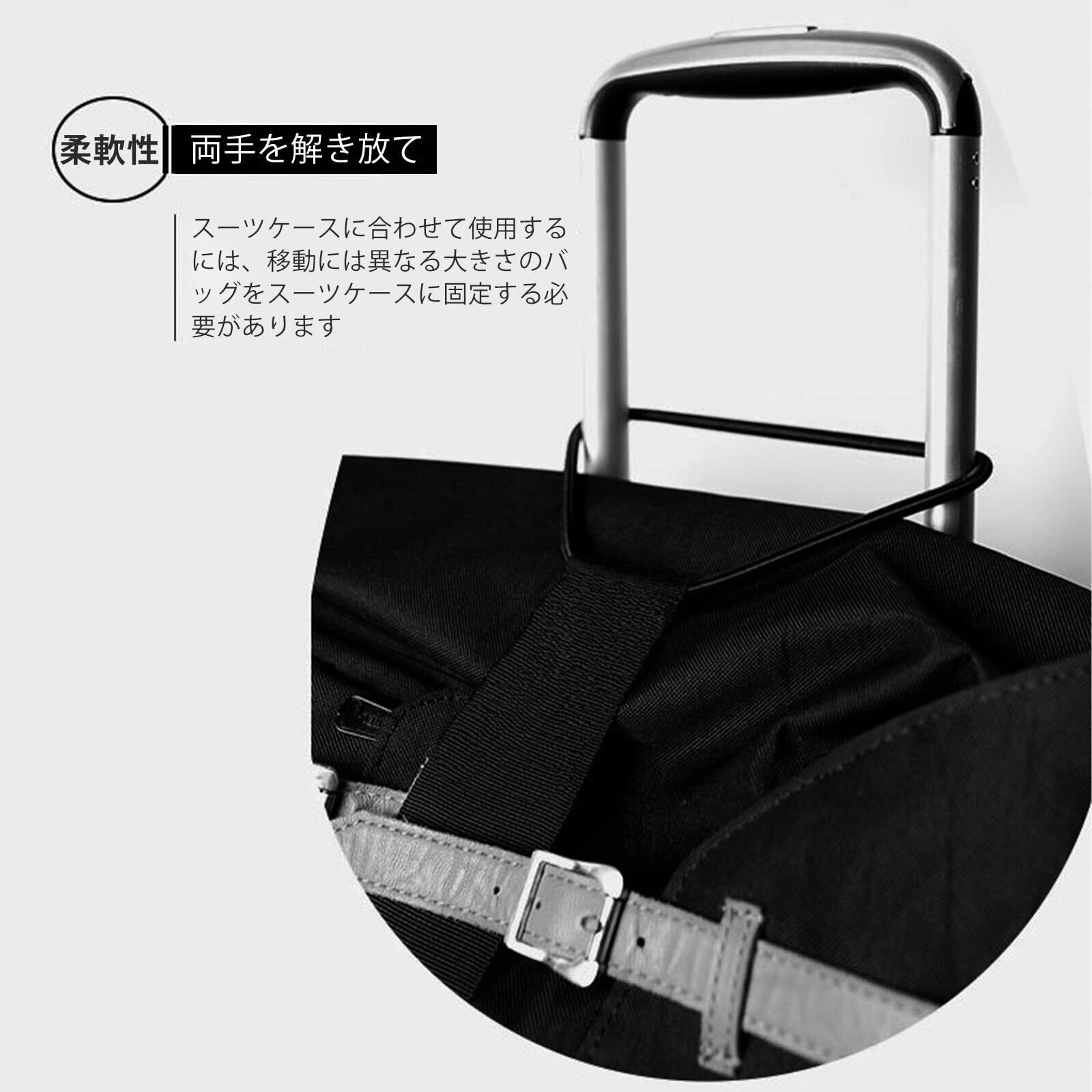 【シーン】トラベルバッグ・キャリーバックに荷物を簡単に固定することができます。 ほとんどのスライドハンドル付旅行用キャリーに使用可能です。出張 国内旅行 海外旅行 電車 飛行機 移動時に キャスターバッグを持っていくときに役に立ちます。使わないときは畳んで旅行バッグの中にしまっておけるコンパクトさも人気の秘密です。