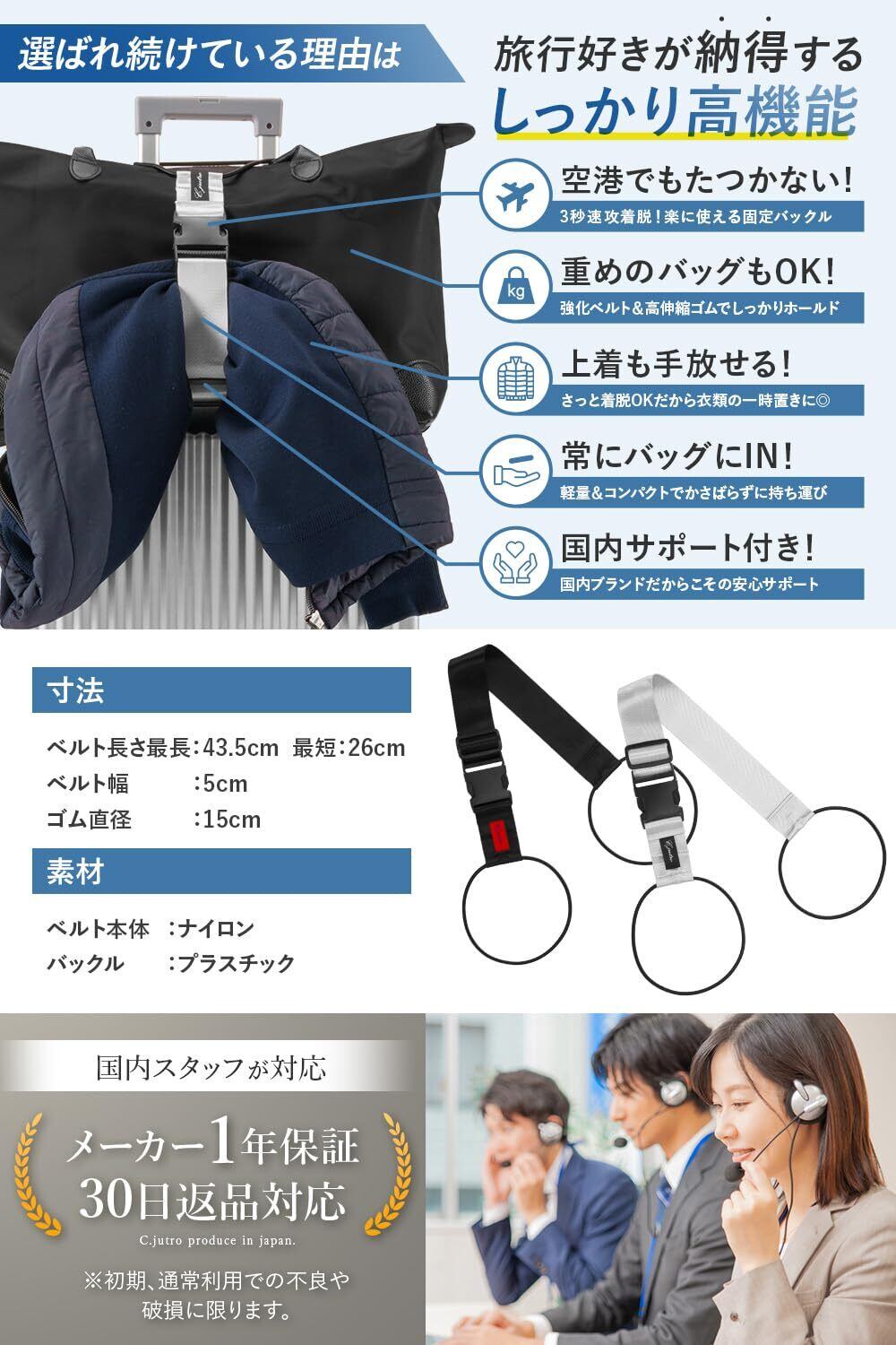 【特徴】このベルトの最大の魅力は、バックル式で簡単に着脱できる点です。わずか3秒で装着でき、急いでいるときでもストレスなく使えます。荷物がずれ落ちないよう高伸縮ゴムと強化ナイロン素材を採用し、重いバッグやリュックでもしっかりホールド。さらに、ジャケットや買い物袋、小物ケースなども一時的に固定できるため、使い方は自由自在です。