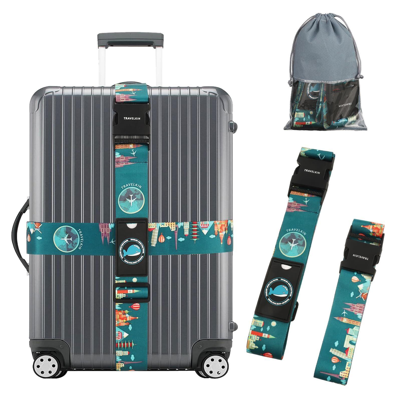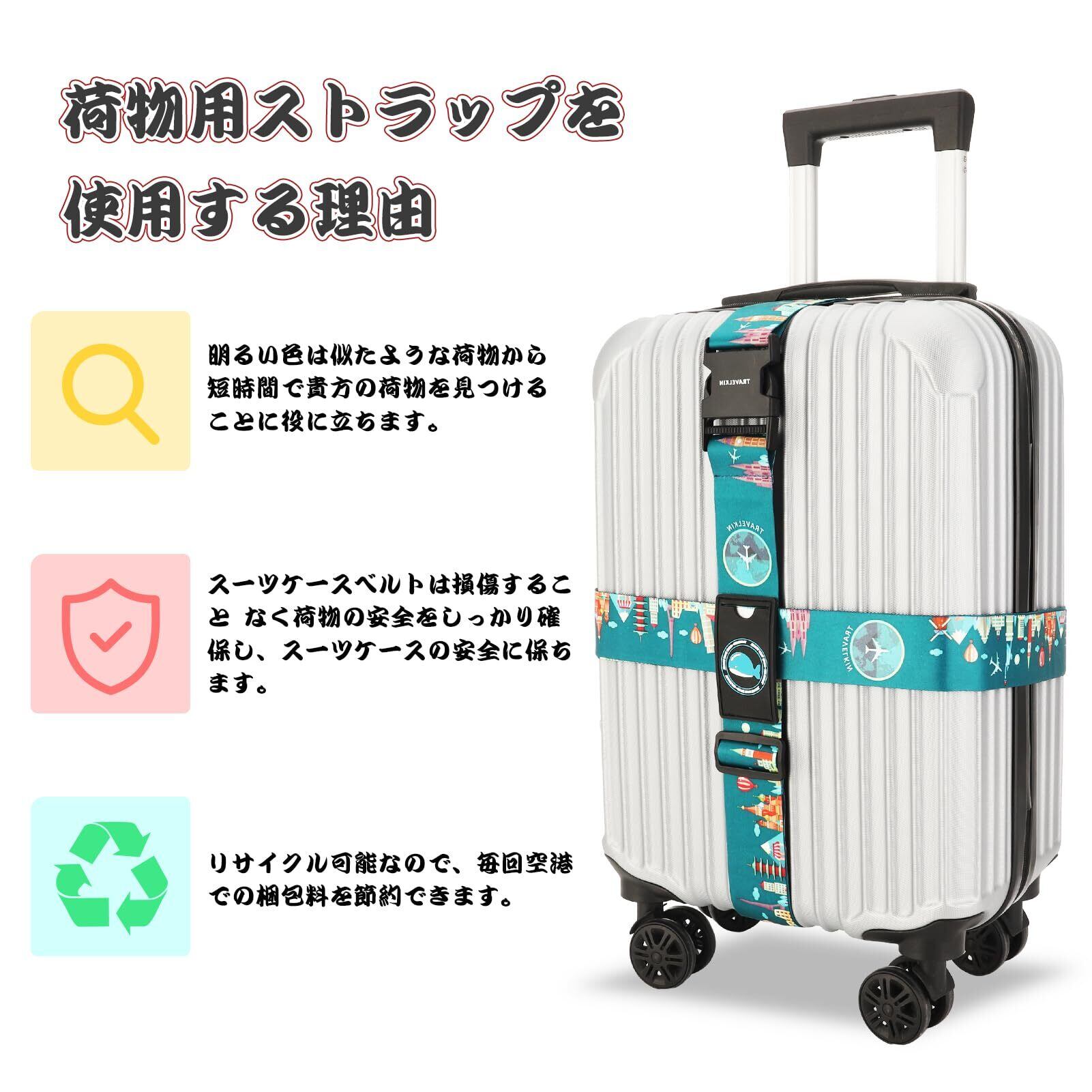 スーツケースベルト ワンタッチ式 十字型 トランクベルト 荷物ストラップ 盗難防止 旅行 出張 サイズ調整可 ネームタグ付 収納袋付き