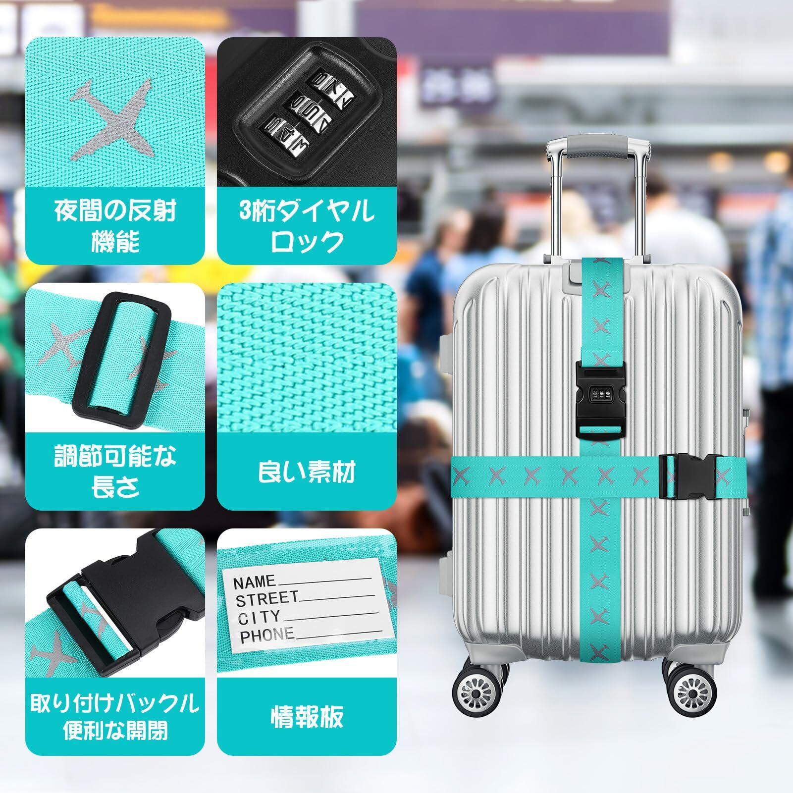 スーツケースベルト 2個セット 十字型 3桁ダイヤル式 調節可能 反射性素材 トランクベルト ネームタグ付 盗難防止 旅行 出張 収納袋付き