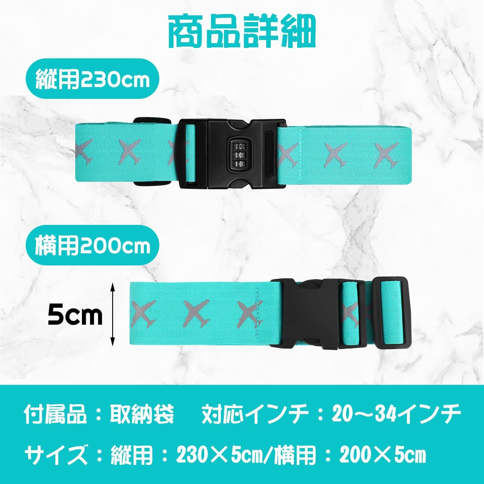【サイズ調節可能】2つのスーツケースベルトの長さはそれぞれ200/230cmです。20~34インチのスーツケースに対応できます。小さいスーツケースから大きいケースまで幅広く使用することができます