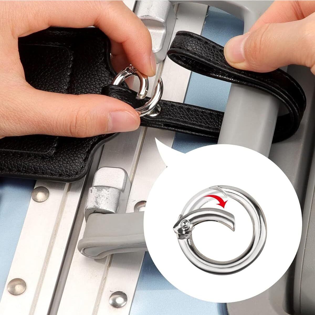 3.【取り付け方が簡単】荷物タグと同じな色のベルトが付き、ベルトの末には丸いカラビナが付き、スプリングリングを押し、ネームタグをスーツケースに取付と取り外しが簡単です。 本当に便利でシンプルで巧妙なデザインです。