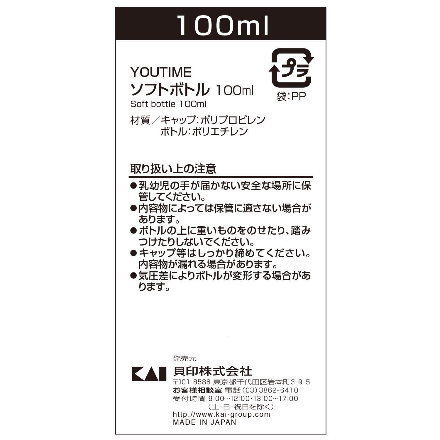 【人気商品】貝印(Kai Corporation) ソフトボトル 100ml ボトル 化粧ボトル ぼとる 透明 容器 旅行 トラベル YOU TIME (シャンプー・リンス等の使用に) 1個