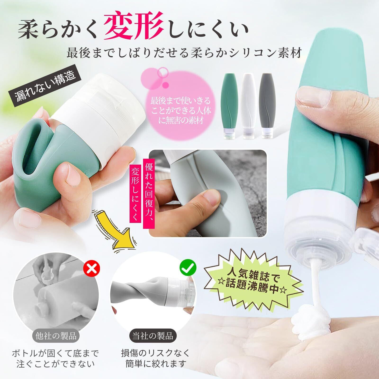 【絞りやすいシリコン製ボディ】BPA不使用、FDA規定適合シリコン製なのでシャンプーや化粧品など以外にも調味料などの食品も入れることができます。 そしてこのトラベルボトルは、どんなに強くにぎっても変形せず、絞って最後までしっかり使い切れます。 とてもよい触り心地です。