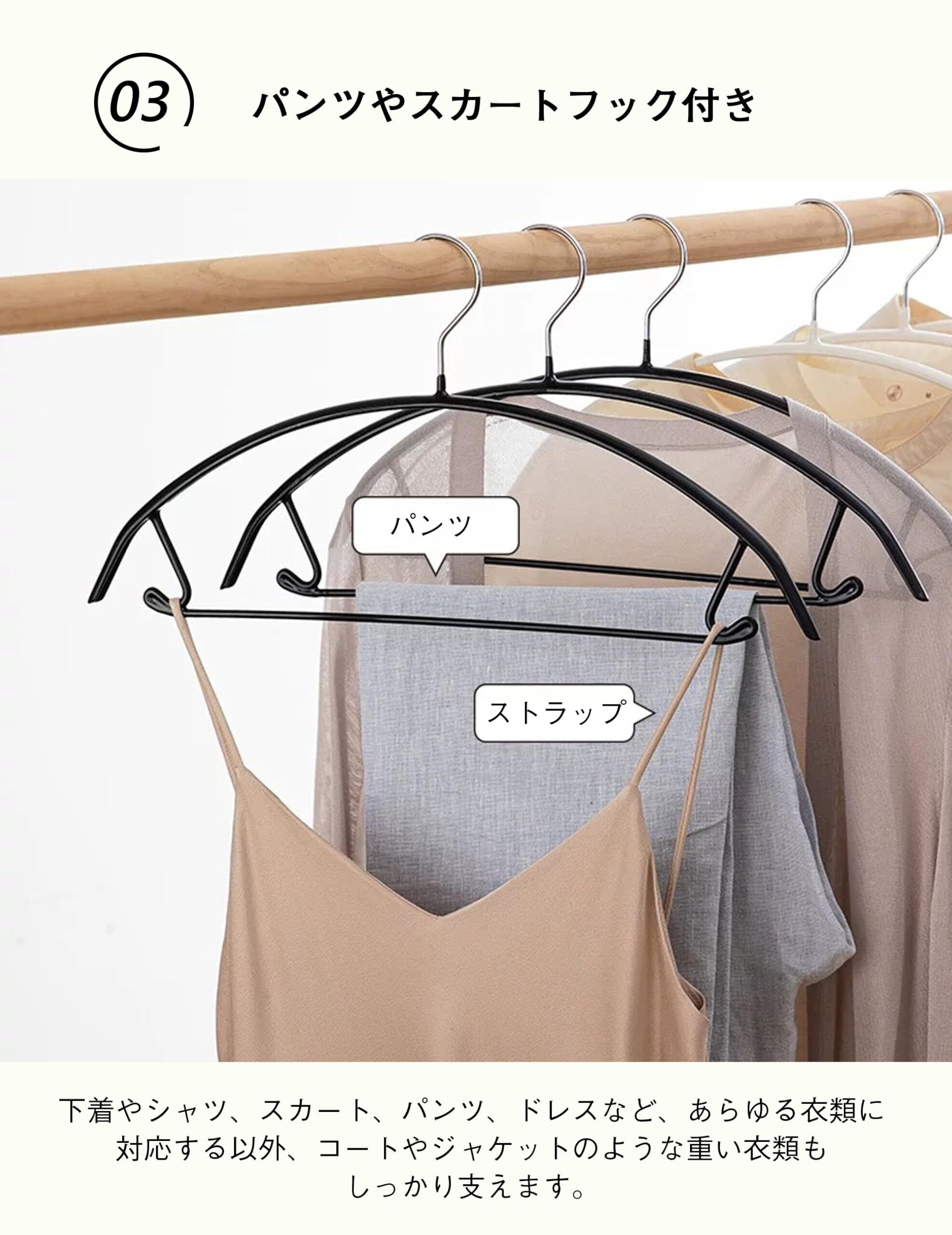 【省スペース設計で収納力UP】木製やプラスチックハンガーなどに比ベてスリムなので、スペースを取らなくてスペースを節約できます。プラスチックハンガーよりも耐久性があり、長期間使用できます。クローゼットの整理整頓に最適です。「商品詳細」サイズ:約W42cm × H20cm 耐荷重:約8kg 2年間の品質保証付き、ご不明な点がございましたら、お気軽にお問い合わせください。