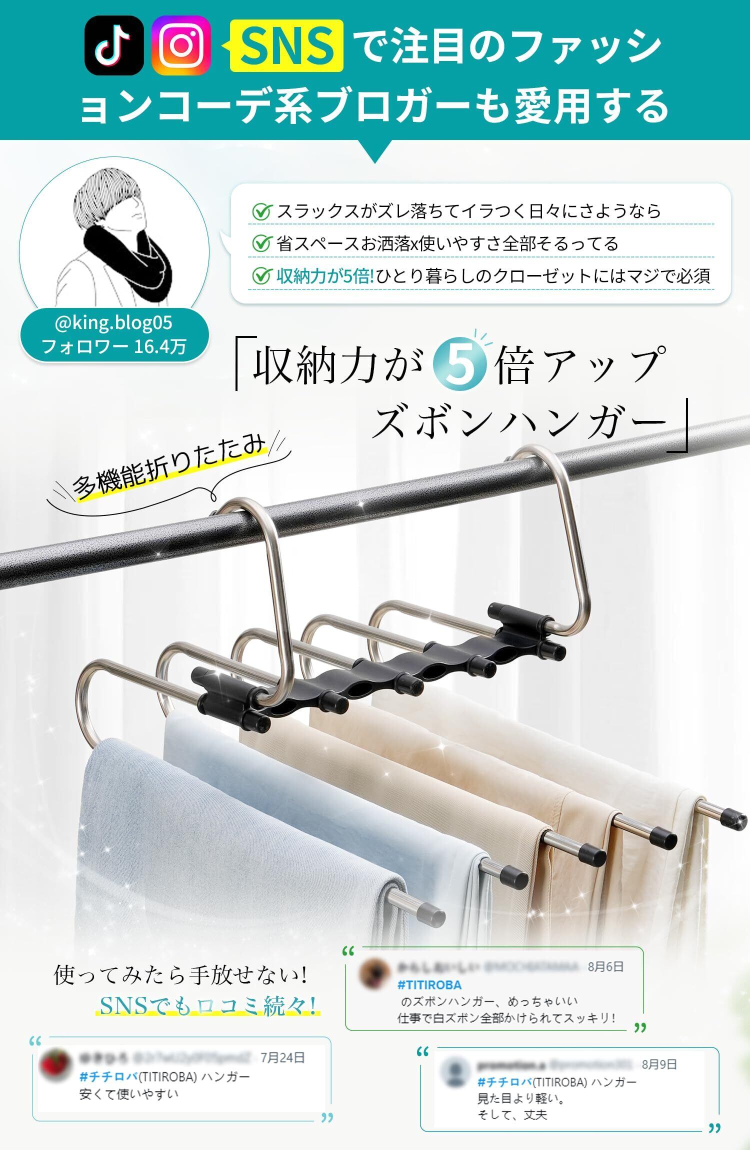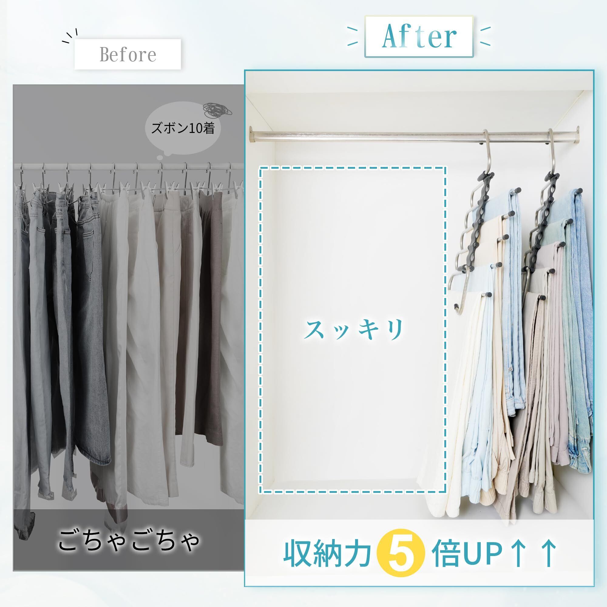 【省スペースズボンハンガー】5連折り畳み式のデザインによって、空間を最大限に利用できて、ジーンズ、ズボンが同時に5つ収納可能となります。