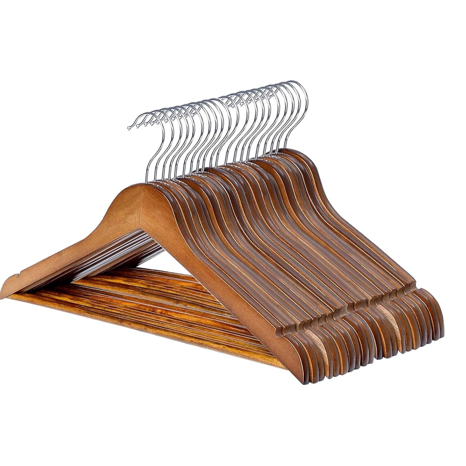 【新春セール】木製ハンガー 天然メープル材 スーツ シャツ ジャケット コート用 滑り止め溝付き ズボンレール付き 360度回転 茶褐色 20本セット