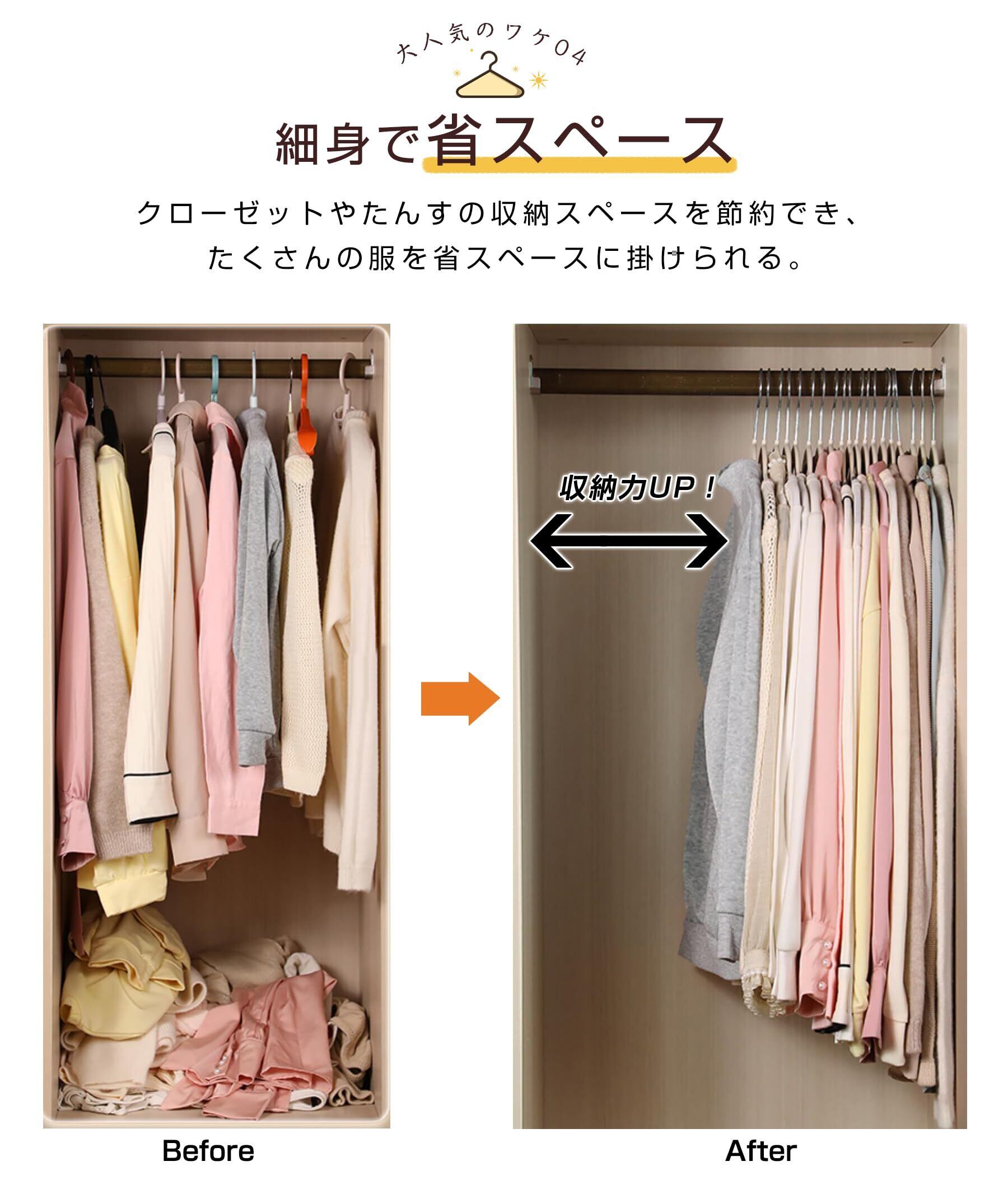 【スタッキング機能】連結フック付きのユニークなデザインで、複数のハンガーを簡単に連結でき、ワードローブ内のスペースを最大限に活用できます。 Tシャツ、パンツ、スカートなど、すべてきれいに掛けられます