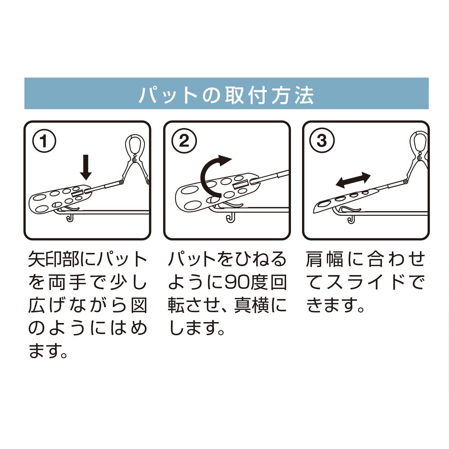 【伸縮自在のハンガー】立体的にきれいに干せるパット付スライド式ハンガー。肩の部分を立体的に干せる穴あきパット付きで、洗濯物の型崩れを防ぎ、綺麗に干せて乾きが早いのが特長です。パットはスライド式で衣類に合わせて調節でき、取り外しも可能です。