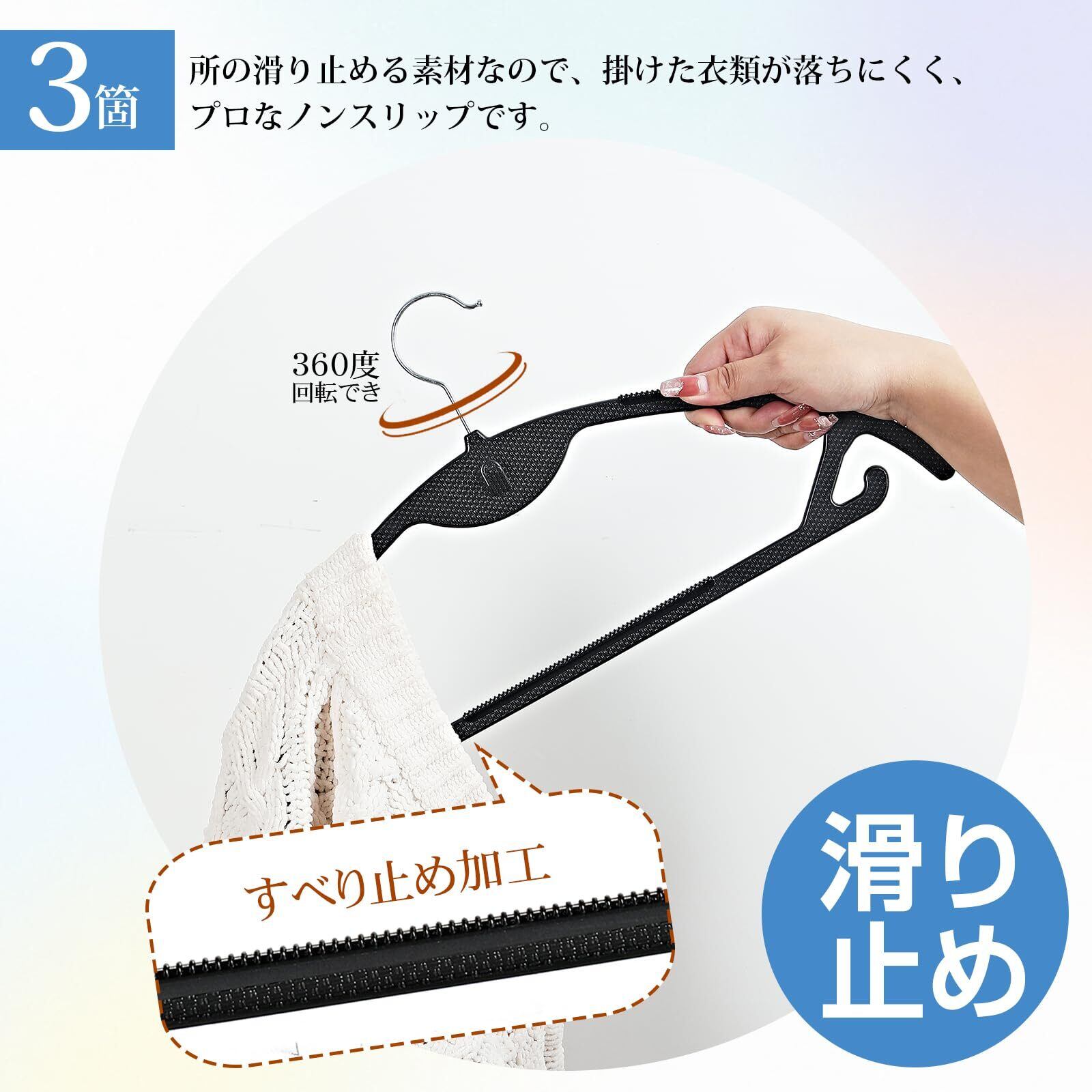 【すべらないハンガー&多機能】ハンガーの肩部分と下側は3か所に滑り止めの材質が付いていて、衣類をしっかりキップできる滑らないハンガーです!Tシャツ、セーター、コート、スカート、洋服はもちろん、ズボン、タオル、マフラーでも大丈夫です。ハンガーの下に小さいフックが、キャミソールも掛けられます。