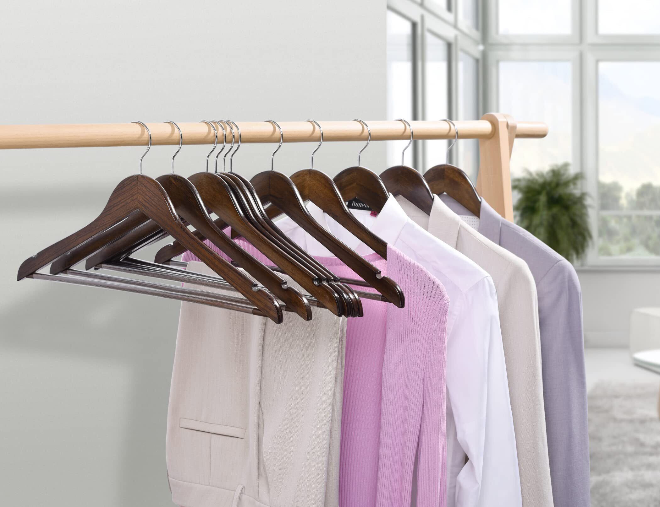 Amber Home 木製ハンガー ズボンバーが付い 回転式フック 滑り止め凹み付き 省スペース 洋服・スーツ・ジャケット・シャツ・ズボン・パンツ・ジャケット・コート用 型崩れ防止 シワ防止 クローゼット収納整理 20本組セット 胡桃色 ダークブラウン