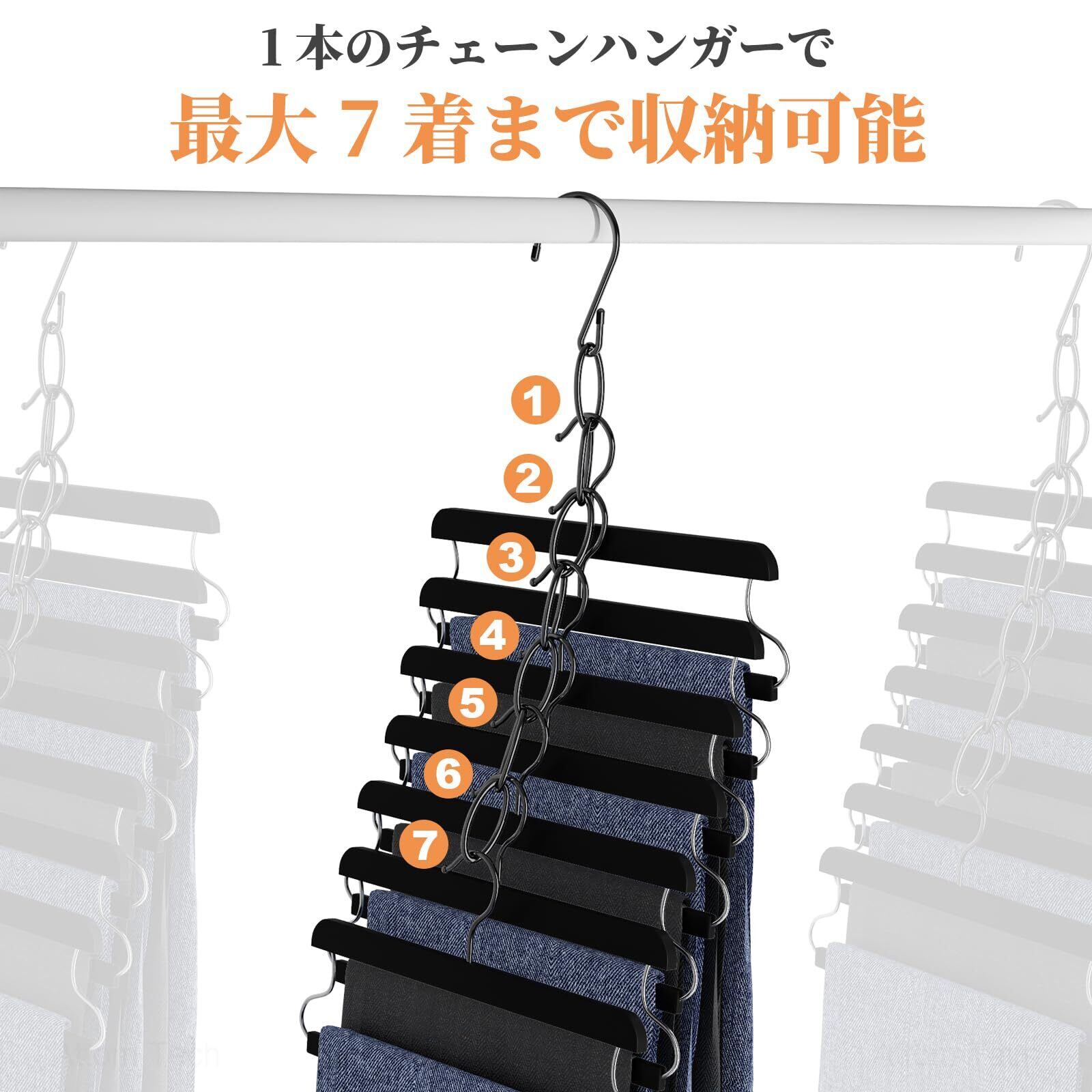 【耐久性に優れた素材】 高品質な鉄素材を採用した省スペース吊り下げチェーンは、頑丈で耐久性に優れ、壊れにくい設計です。各ハンガーチェーンには縦に7つのループが連結されており、複数の衣類をまとめて掛けられるため、クローゼットのスペースを有効活用できます。