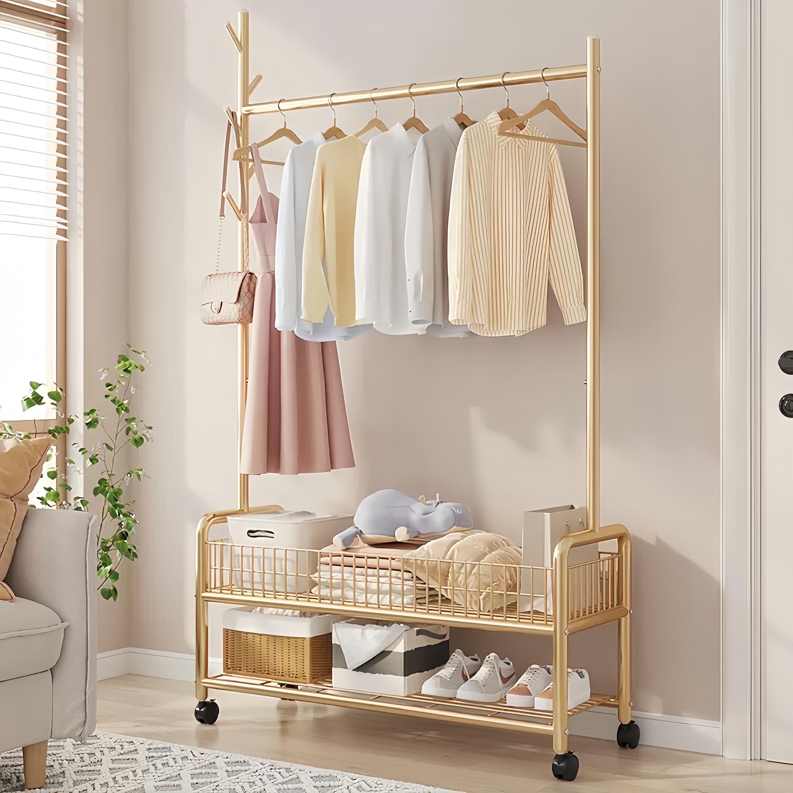 【在庫処分】ハンガーラック 衣類収納 コートハンガー おしゃれ 洋服ラック バスケット付き 棚付き キャスター付き 幅90*奥行き35*高さ176cm 組立簡単 スチール製 頑丈 寝室 リビングルーム ゴールド