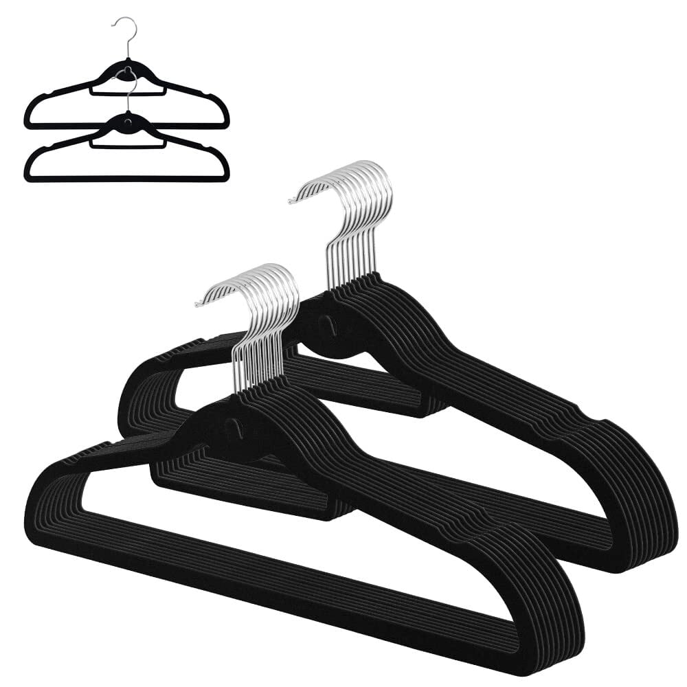 【在庫処分】滑らないハンガー 20本 ハンガー 連結収納 薄型デザイン 薄く滑り止め 植毛製 360°回転フック 黒 省スペース スーツ ジャケット ハンガー 連結 コート サスペンダー 連結フック付き hangers 衣類用