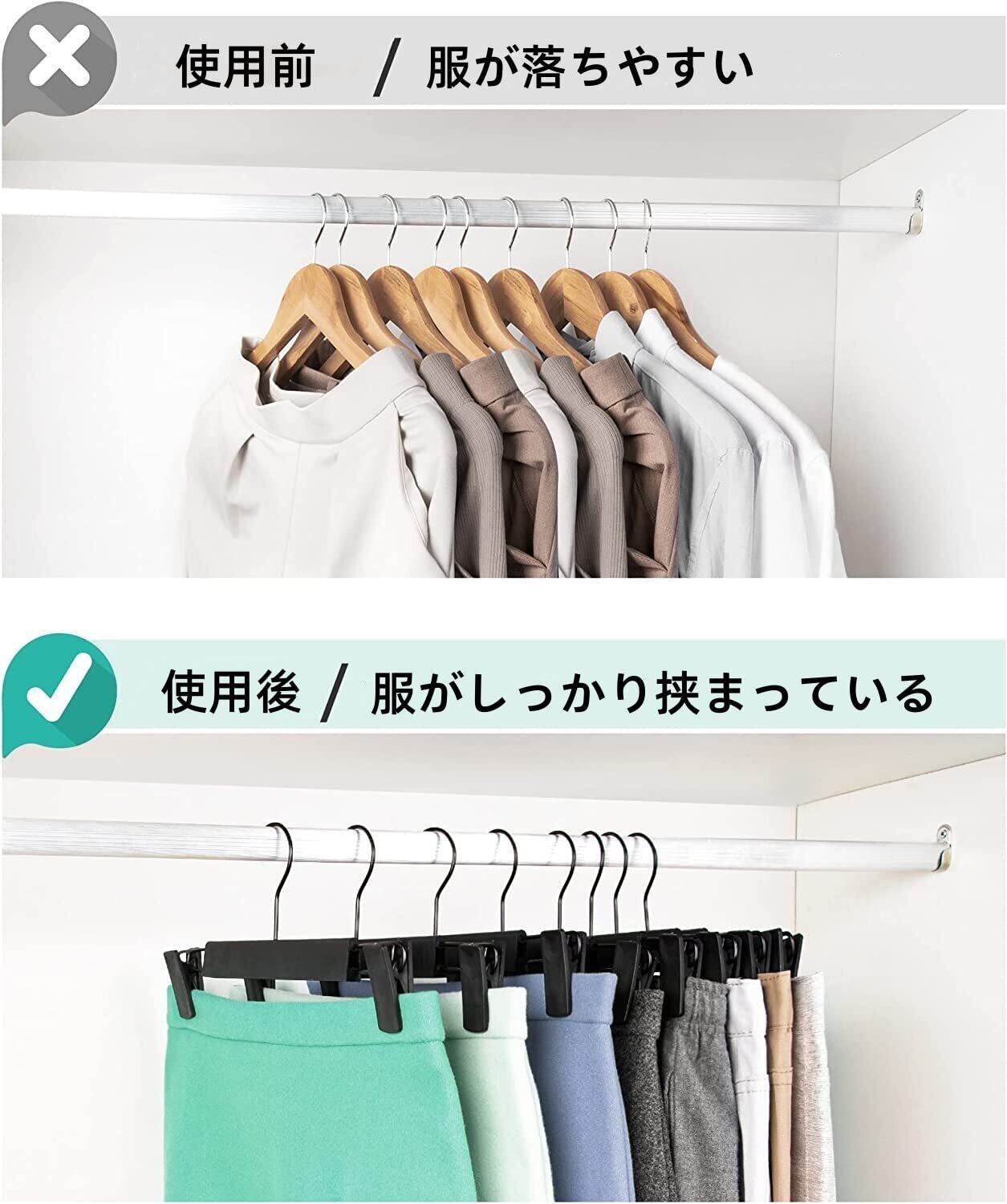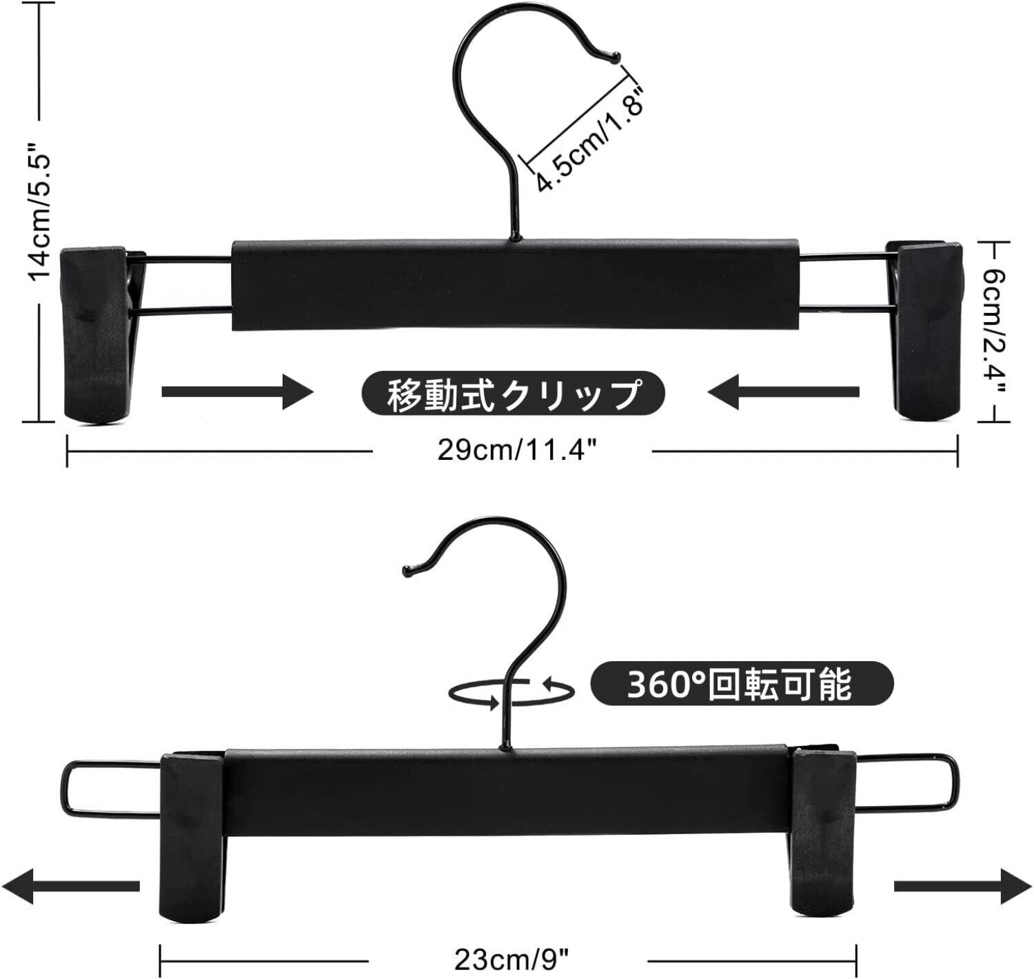 【移動式クリップハンガー】ズボンハンガーごとに2つの移動式クリップが付いています。クリップの距離は23--29cmで、服の大きさに合わせて調節できます。ですから、このズボンハンガーは大人の服も子供の服も収納できます。