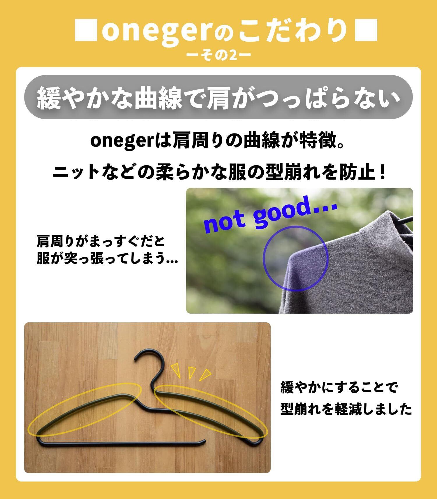 「Tシャツやニットを長時間掛けっぱなしにすると、肩がピンと突っ張ってしまう」という悩みもonegerが解決。 長時間掛けていても服に負担を掛けないよう、大きくゆるいラウンド肩の形状をしています。