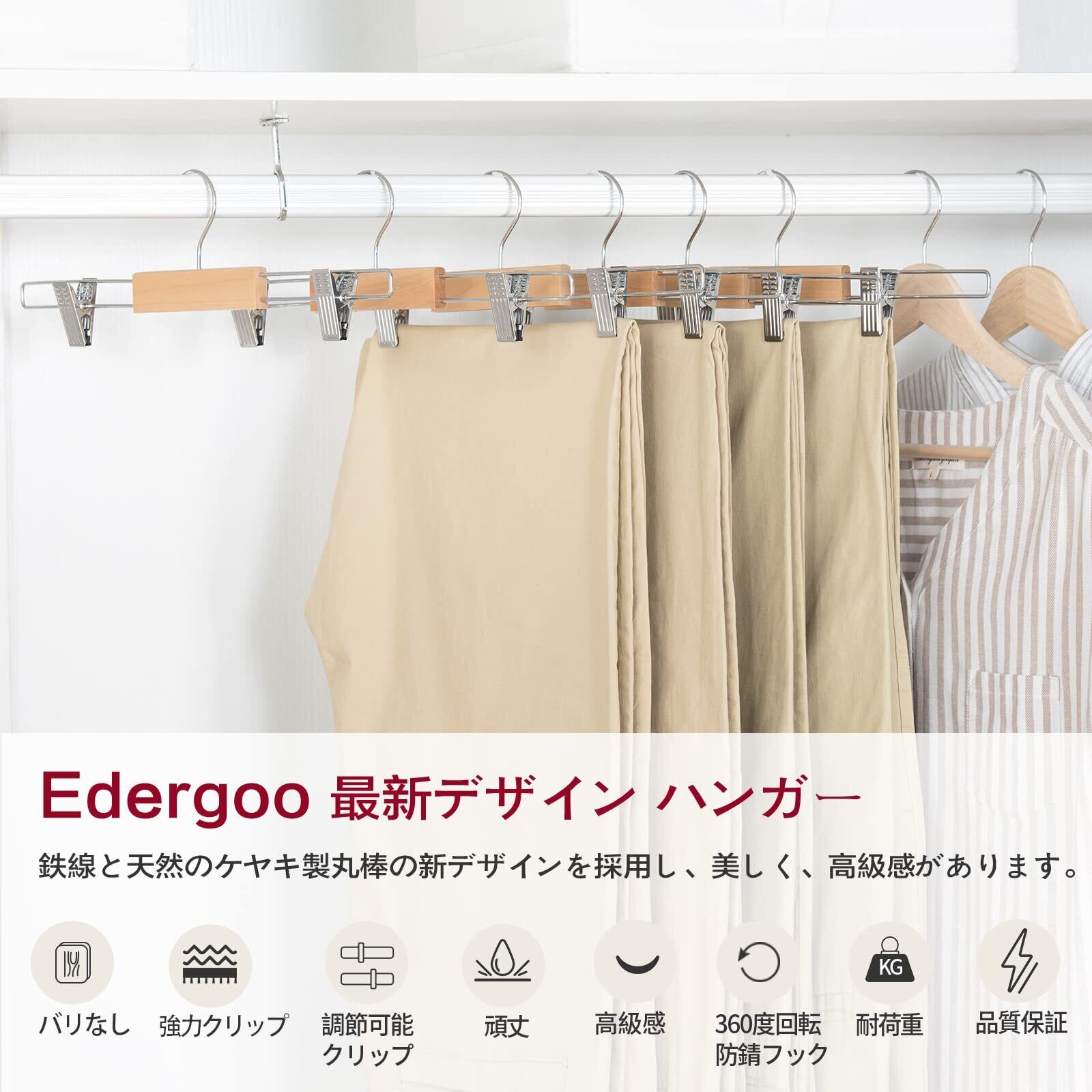 【他にないデザイン アップグレード ハンガー ズボン】Edergooズボンハンガーは、全長を維持しながら、木材チップの長さを短くする新デザインを採用。自然でプレミアムな感触を保ちながら、スカートハンガーをより実用的にしています。クリップの可動範囲は12cmで、幅15cmの子供服から幅37cm以上の服まで適用されています。