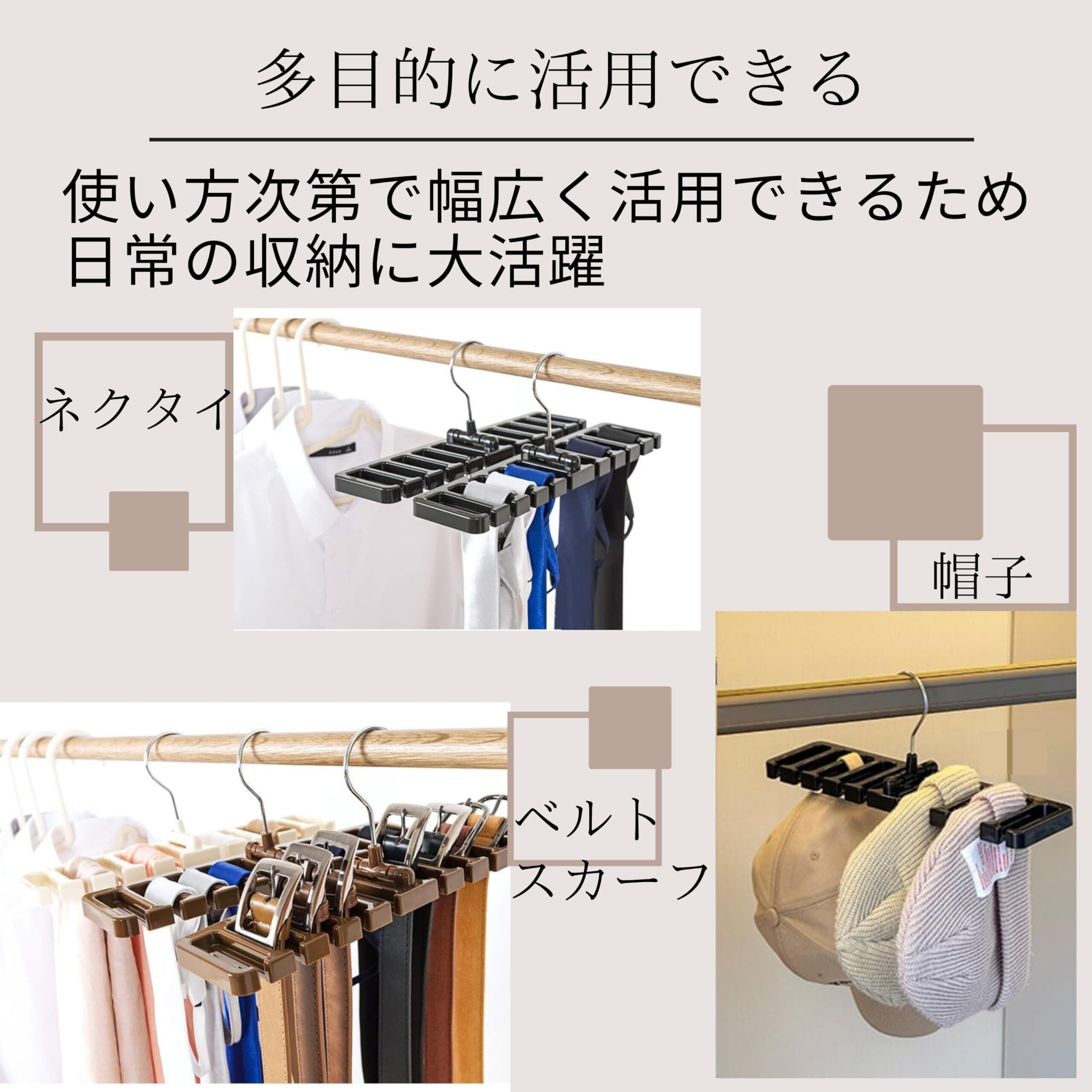 【用途・シーン】 ベルトやネクタイ、スカーフなどをまとめて収納可能。クローゼットや収納スペースをスッキリ整頓し、取り出しやすさを向上させます。