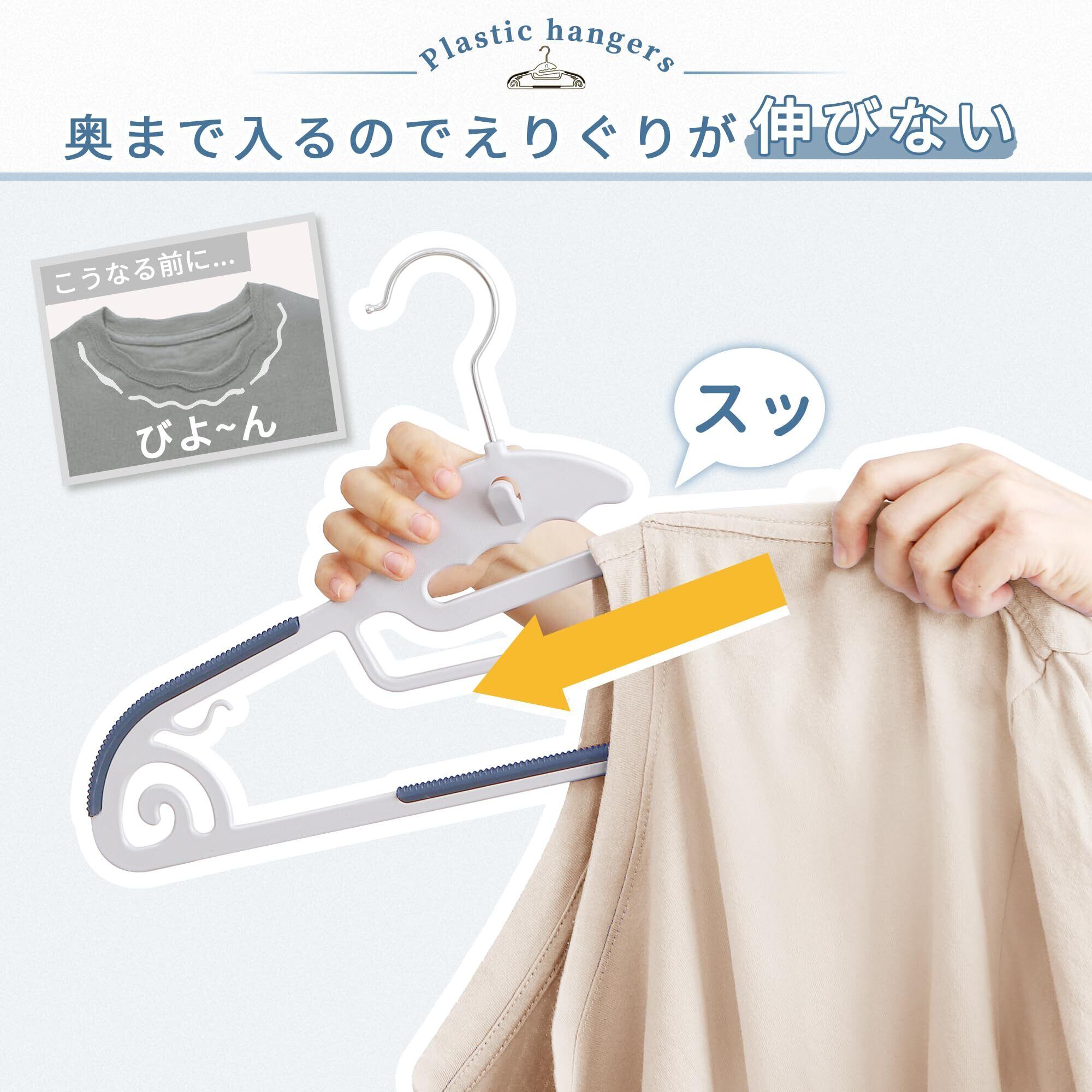 【本当に滑らない!滑り止め加工で衣類をしっかり固定】ラバー加工により、シルクやリネンなど滑りやすい素材の衣類もしっかり固定。薄手の衣類から厚手のアウターまでオールシーズン使える、型崩れ防止タイプのスーツハンガーです。