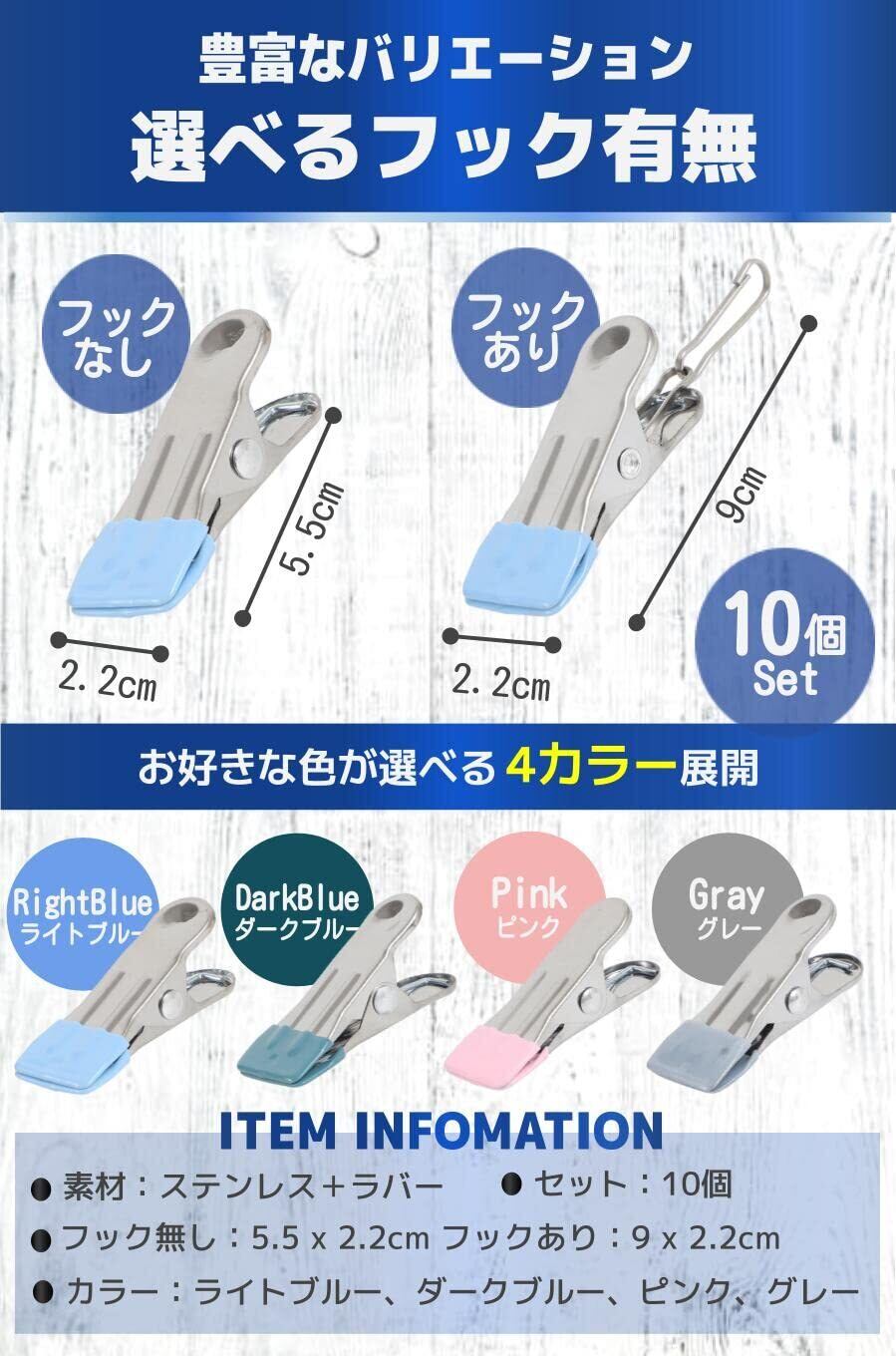 【商品詳細】フック無し:5.5 x 2.2cm フックあり:9 x 2.2cm セット:10個 素材:ステンレス+ラバー カラー:ライトブルー、ダークブルー、ピンク、グレー