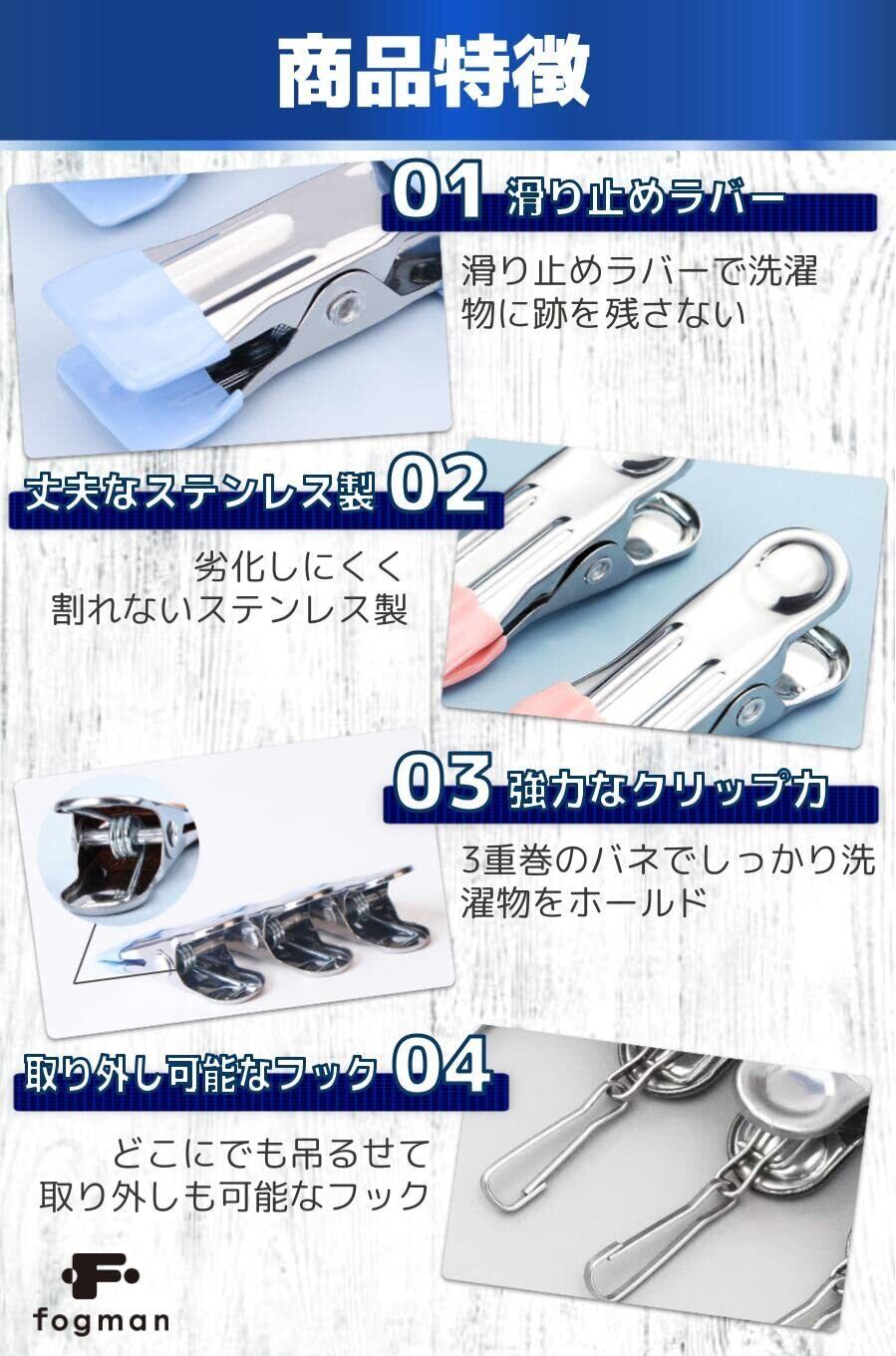 【商品特徴】滑り止めラバー:洗濯物に跡を残さない 丈夫なステンレス製:劣化しにくく割れない 強力なクリップ力:3重巻のバネでしっかり洗濯物をホールド 取り外し可能なフック:どこにでも吊るせて取り外しも可能