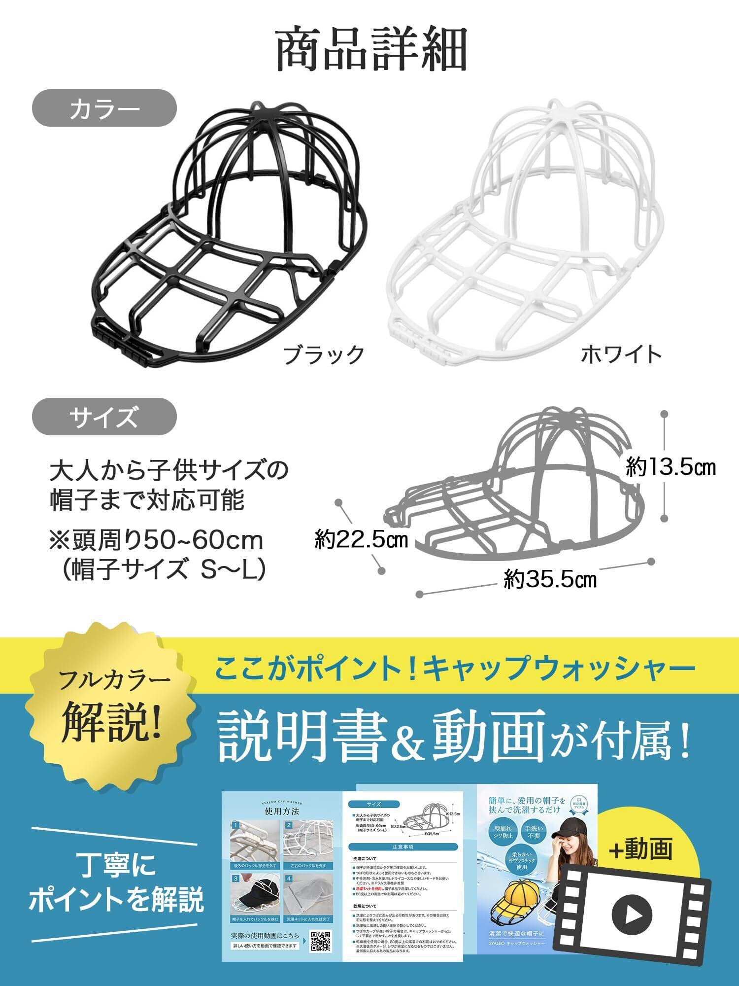 【商品詳細】〇サイズ:縦/約35.5cm、横/約22.5cm、高さ/約13.5cm(※頭周り50cm~60cm、帽子サイズS~L)〇素材:PPプラスチック〇カラー;ブラック、ホワイト〇セット内容:キャップウォッシャー、洗濯ネット、説明書、解説動画 〇ブランド:SYALEO