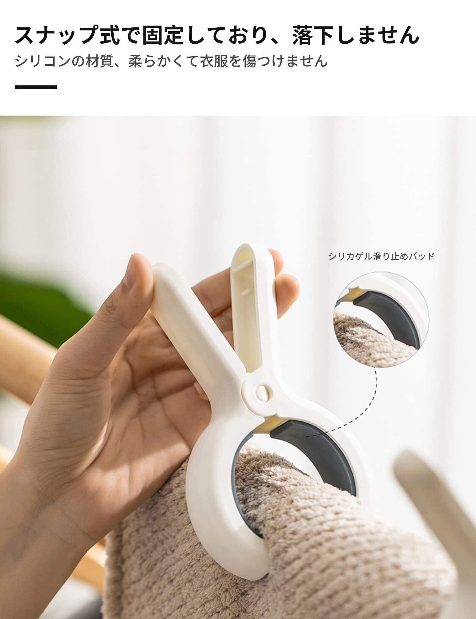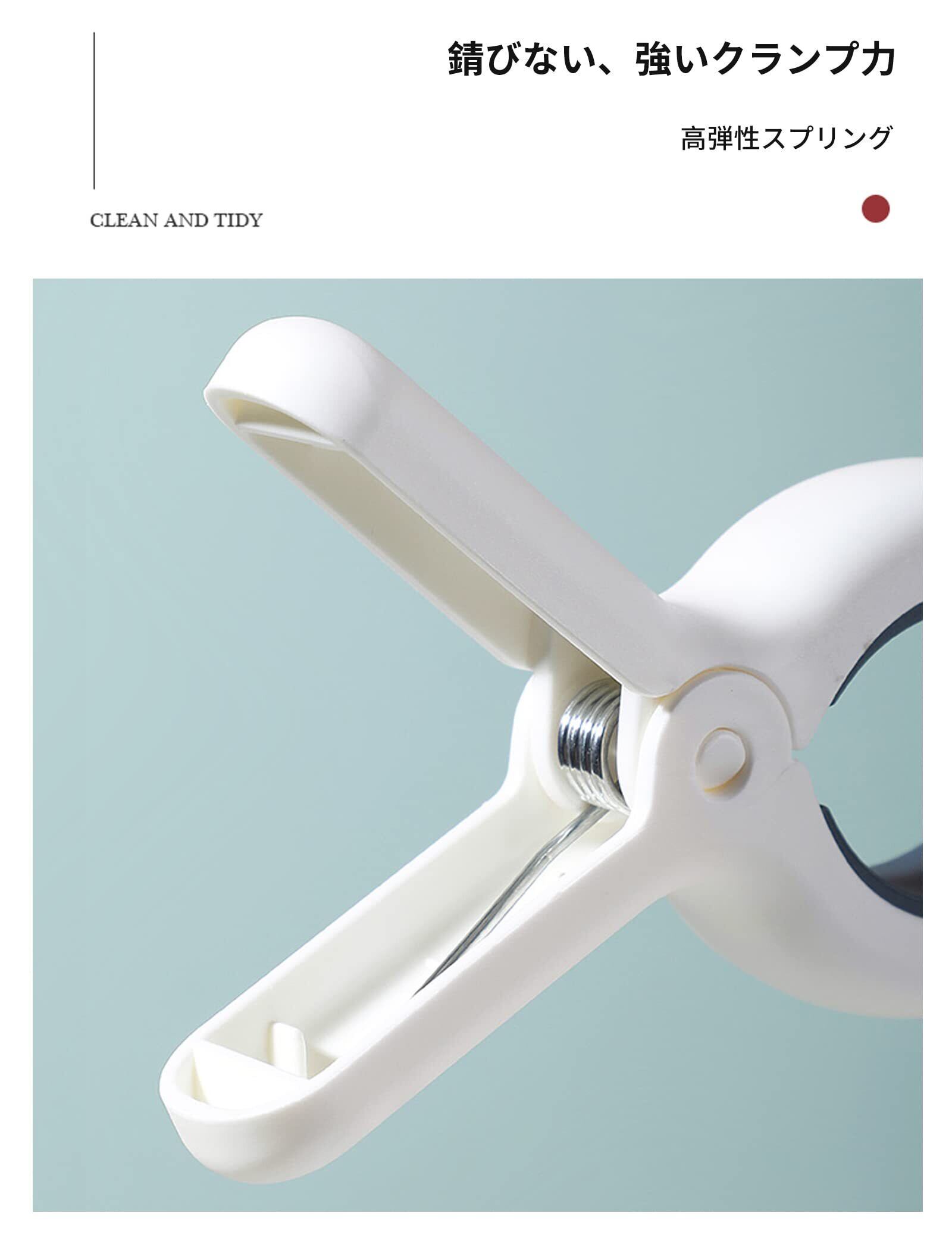 【大きいサイズ】クリップ開口部:7CM、長さ13CM、幅9CM。 クリップ数:3。 【跡を残さないデザイン】クリップの内側には、シリコンの滑り止めマットが取り付けられており、滑り止めだけでなく、服を挟んでも跡が残らない。 【強力スプリング】高弾性スプリング、クリップのクランプ力が大きく、防風効果が高く、屋外でも使用できます。 【多目的】寝具、シーツ、カーテン、衣類のグリップに。 【家庭・旅行】日常使い、家庭や旅行に最適です。 軽量で頑丈な構造で、どこにでも収納できます。