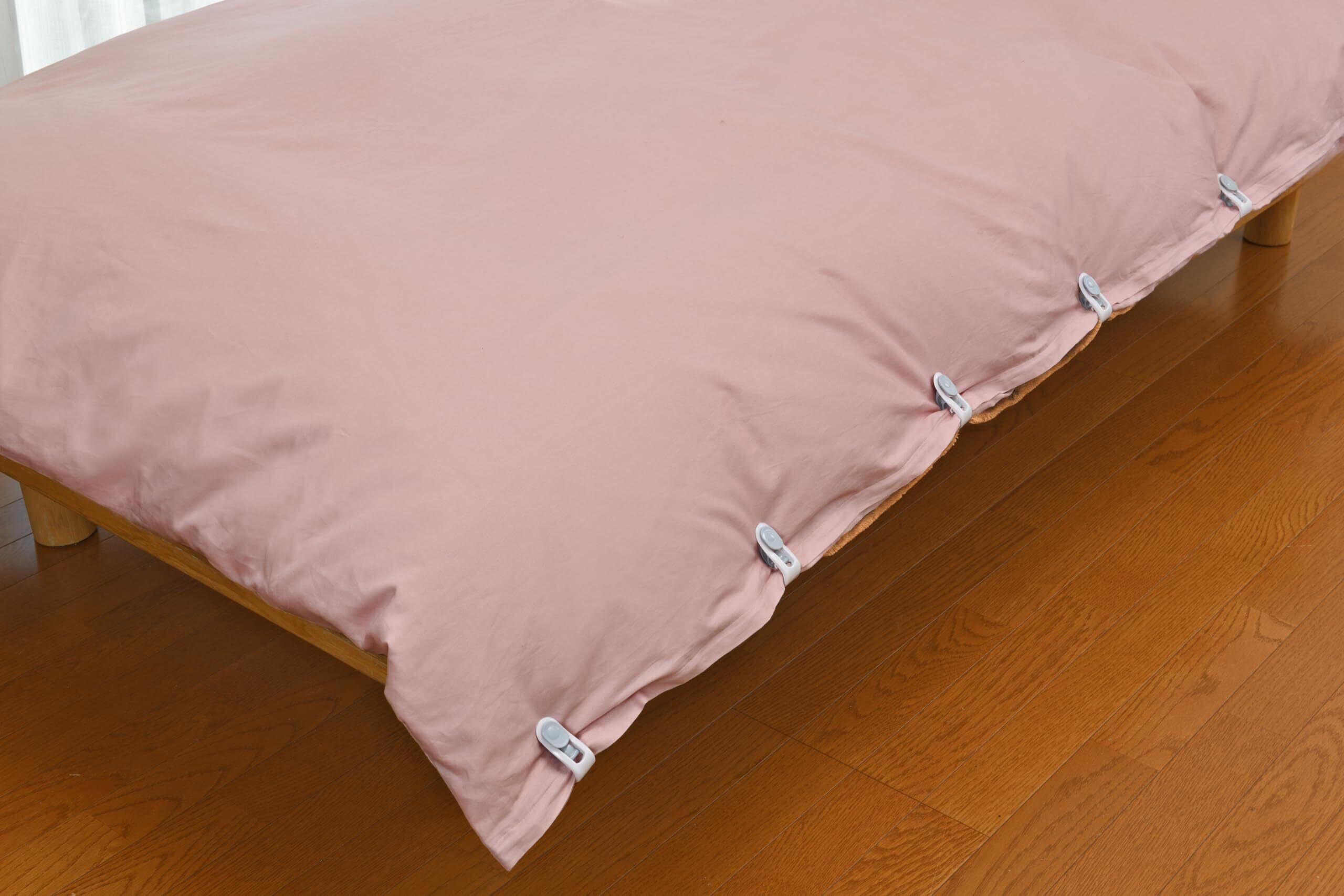 布団とシーツをクリップで挟むことで布団がシーツから離れないようにします。