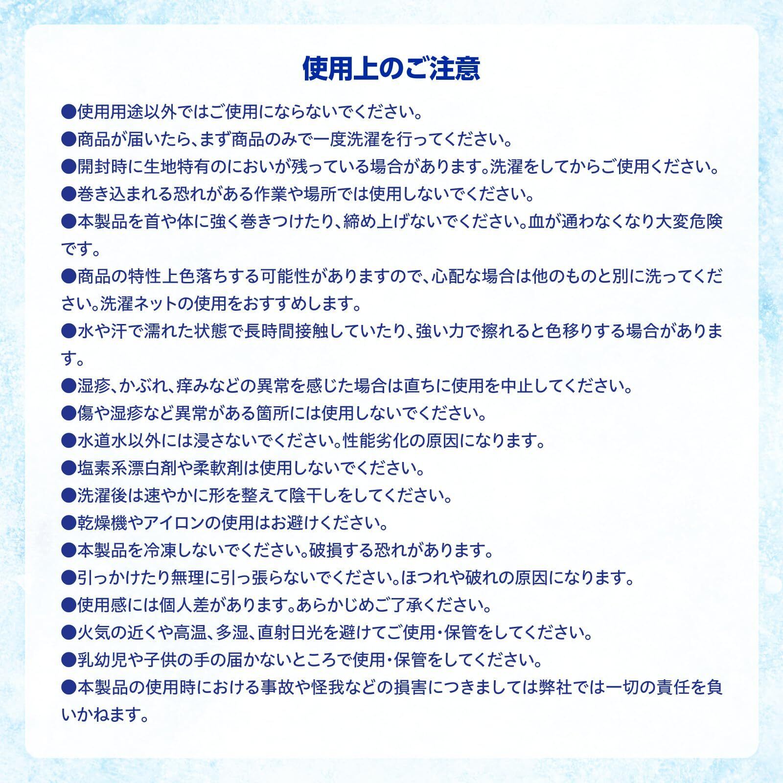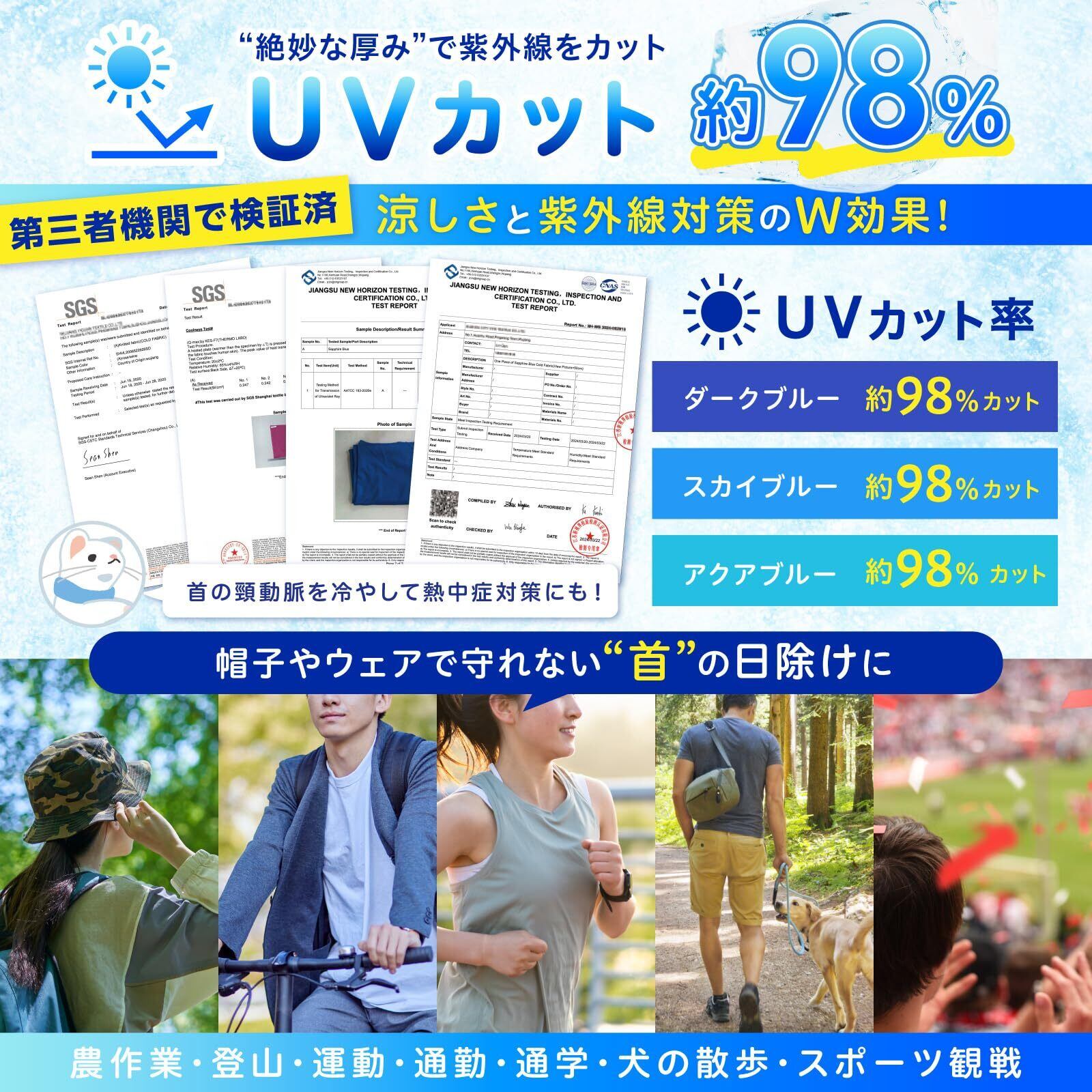 ▶【ひんやり冷感2層構造】:当商品は蒸発層と吸水層の2層構造となっており、絶妙な厚さで高い冷却効果を実現しています。▶【UVカット効果】:最大98%のUVカット効果で、日焼け対策にも優れています。(UVカット効果は、3色とも第三者機関にて検査を行い実証されています。)