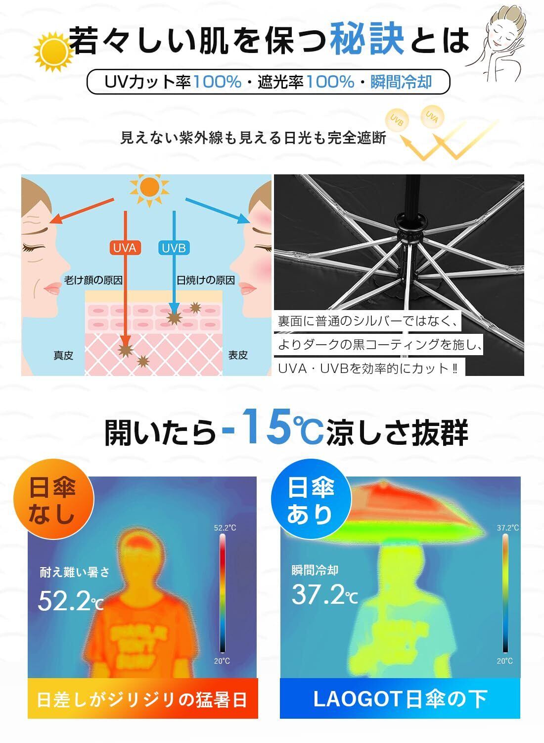 【紫外線対策の決定版!】JIS規格に適合した高密度遮光素材(UVカット品)を使用した折りたたみ傘です、99%以上のUVカットで真夏の日差しも安心、波長380nmまでの広範囲紫外線を徹底遮断(※検査機関実測値)、日傘なのに「涼感設計」!体感温度-10℃の遮熱効果で灼熱対策。