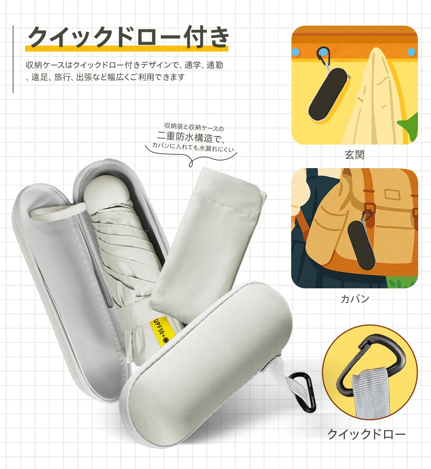 【超軽量コンパクト & フック付き】折りたたみ日傘はコンパクトのデザインで、収納した状態でサイズは僅かに17.5cm*4cm、重量は215~220gです。きちんと畳める時間がない時でも付属収納ケースにスムーズに収納可能です。収納ケースはフック付きデザインで、通学、通勤、遠足、旅行、出張など幅広くご利用できます