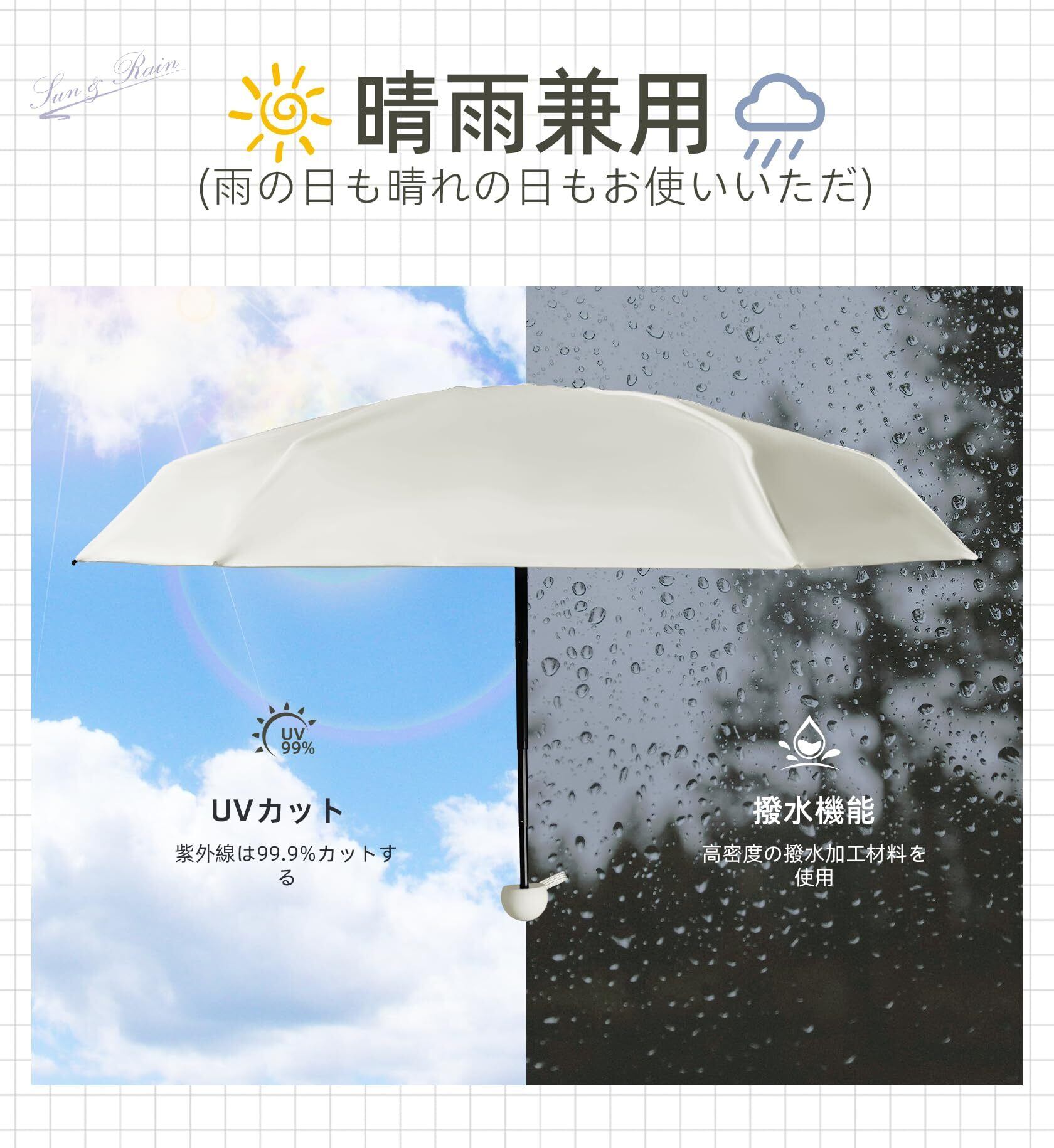 【晴雨両用&撥水機能】高密度の撥水加工材料で作られ、通常の折りたたみ日傘よりも優れた防水機能。軽く振るだけで水滴が玉のように落ち、収納袋と収納ケースの二重防水構造で、カバンに入れても水漏れしません。部屋、デパート、コンビニに入る時他人に邪魔しません。カバンに入れてもふたんにならず、急な雨にも対応できます