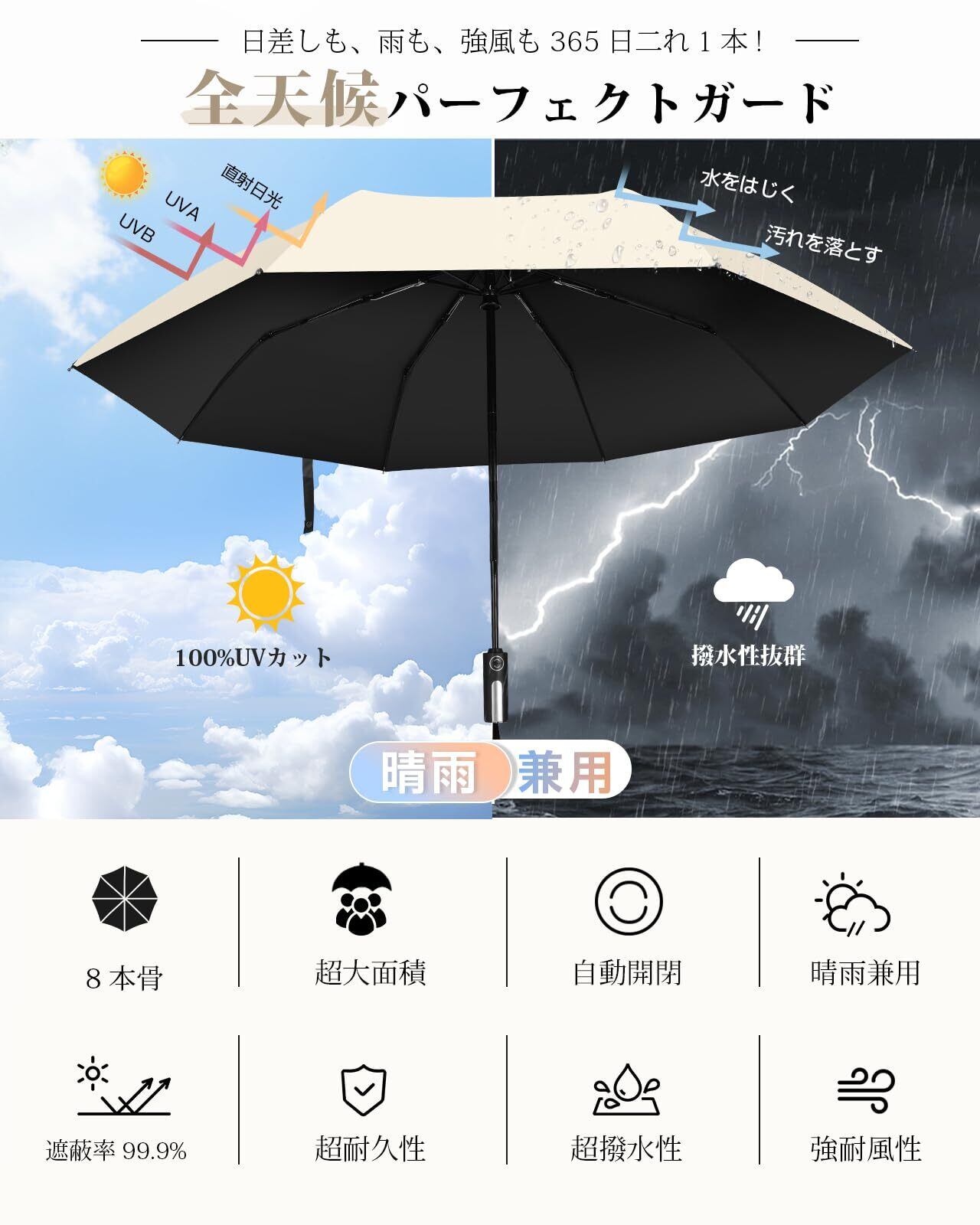 【UVカット&超撥水 晴雨兼用傘】この日傘 uvカット 100 遮光 折り畳みの内側には遮光遮熱コーティングを施され、遮光率100%、UVカット率99.9%に加えて、黒い裏生地が眩しさを軽減し、地面から反射する太陽熱を遮り、強い日差しの季節にも日傘として快適にご利用いただけます。さらに、本日傘 折りたたみは雨が染み込みにくい高密度生地を使用し、表面にはテフロン(Teflon)撥水コーティングが施されています。ひと振り、もしくは数回振るだけで雨粒をほとんど落とせます。満員電車に乗る時に傘の水滴で衣服が濡れないよう周囲への配慮もバッチリ。日差しも、雨も、強風も365日二れ1本!