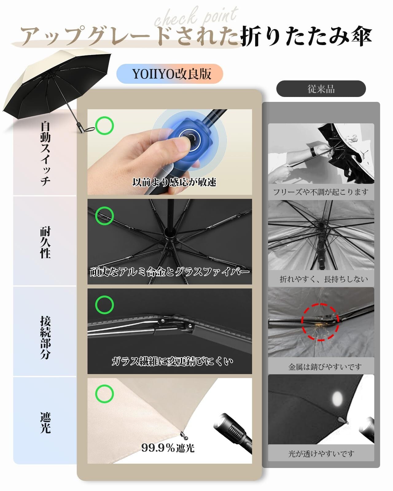 新しいモデルおりたたみ傘では、ボタンを押すだけで、従来の折りたたみ傘 ワンタッチ自動開閉よりもスムーズに開閉でき、開く際の衝撃を大幅に軽減しました。また、自動閉じの動作も軽くなり、手動で柄を収納する際も楽に収めることができます。両手が塞がっている時でも、片手で簡単に操作できるので、車を降りる時や子供を抱っこしている時、荷物を持っている時など、非常に便利です。