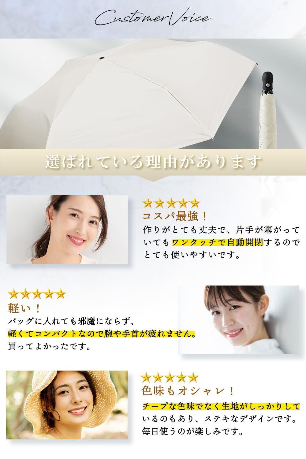 【ワンタッチで自動開閉】ボタンを押すだけで傘がパッと開いて、折りたたみもシュパっと閉じる。片手でカンタンに使えるので荷物を持っていてもラクラク操作。