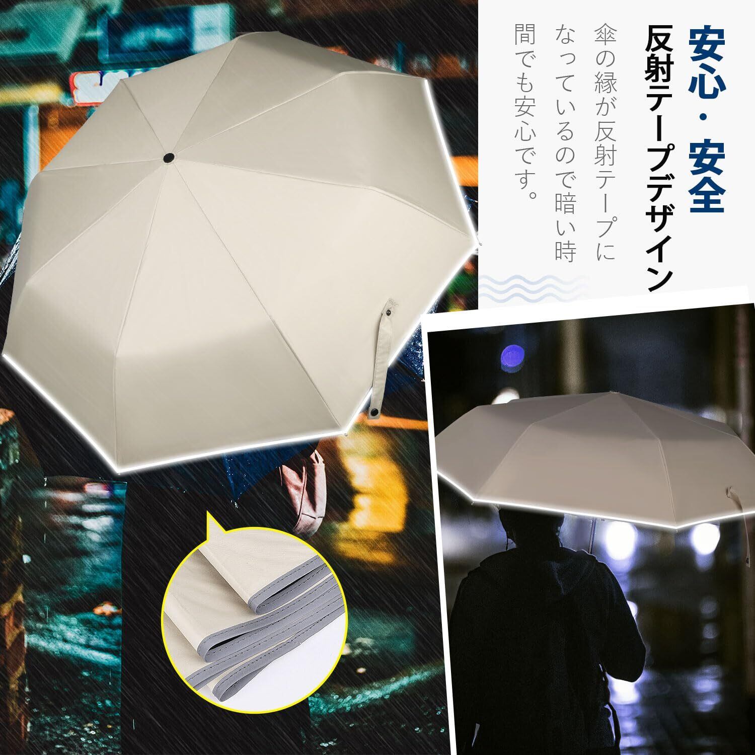 【自動開閉、耐風傘骨】素材:アルミ・210Tポリエステル 重量:約380g 親骨61cm 開く直径は103cmで、弧長116cmまで達し、折りたたむ時の長さは31.8cmです。頑丈で耐久性のあるアルミニウム製の傘骨を8本採用することで高強度を実現、一般的な折りたたみ傘よりも耐風性に優れています。鉄骨傘よりも非常に軽量です。強風下においても、風による傘の「ひっくり返す」が軽減され、骨が折れてしまう事故を抑止します。持ち手は高品質なABS樹脂で作られており、手触りが良く、8cm持ち手フィット感抜群。長時間使用しても手首が疲れにくいです。