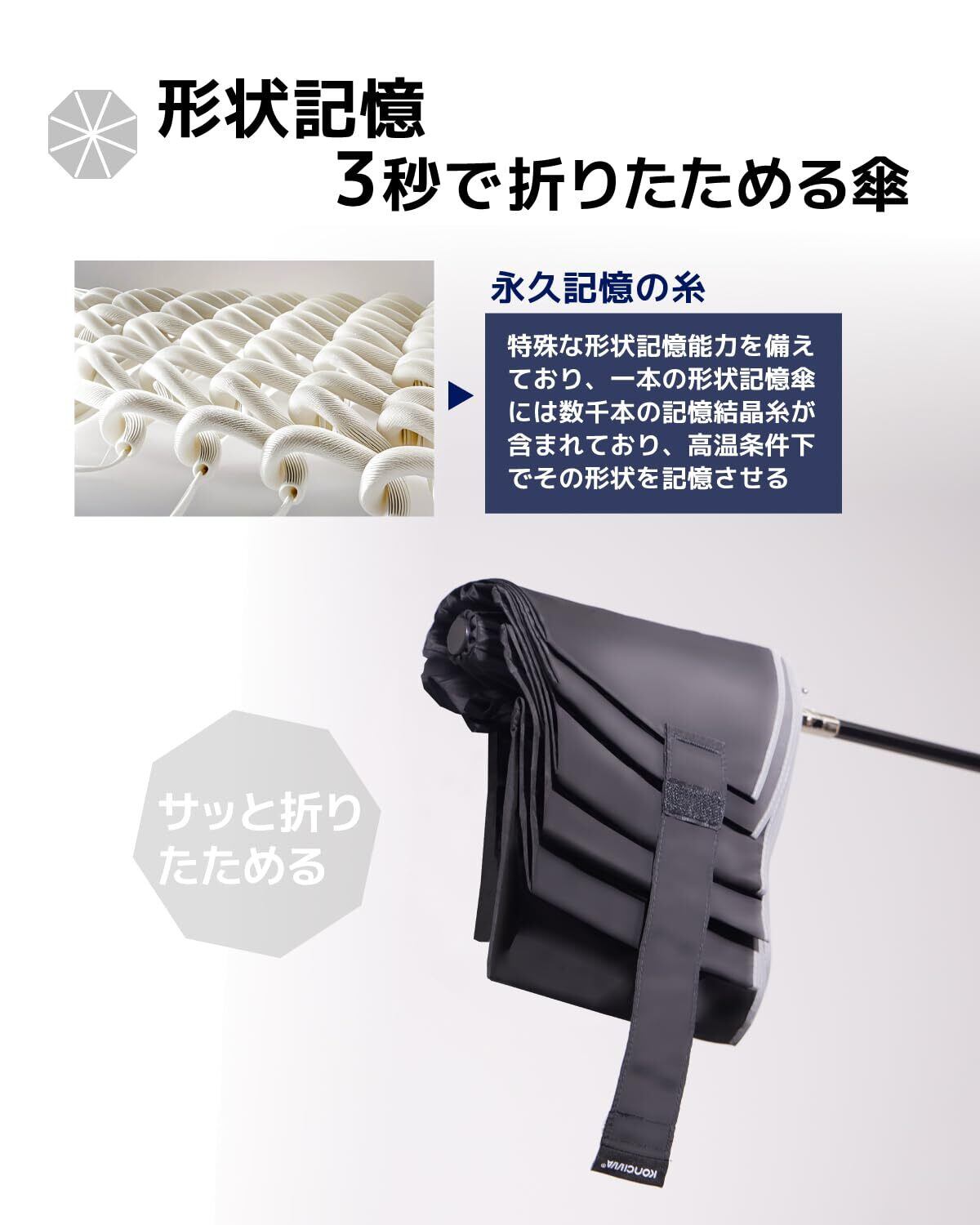 【形状記憶加工】折りたたみ傘の畳みにくい難点を解消するために開発した「MFU」シリーズがついに登場しました!形状記憶加工により、3秒でたためる傘.また、収納時にはかさばらず、綺麗にまとめることができます。一般的な形状安定傘は、傘地にシートを貼り付けて作るため、重さが気になったり、使用している中で剥がれてきたり、骨に負担がかかったりする問題点があります。一方、KONCIWAの傘は形状が安定しています。生地には数千本の形状記憶糸が織り込まれ、高温加工が施されています。これにより、軽量でありながら、形状記憶効果も永久的に維持されます 。たたむ動作が簡単になるので、これまで苦手意識のあった方も使う煩わしさが軽減されます.